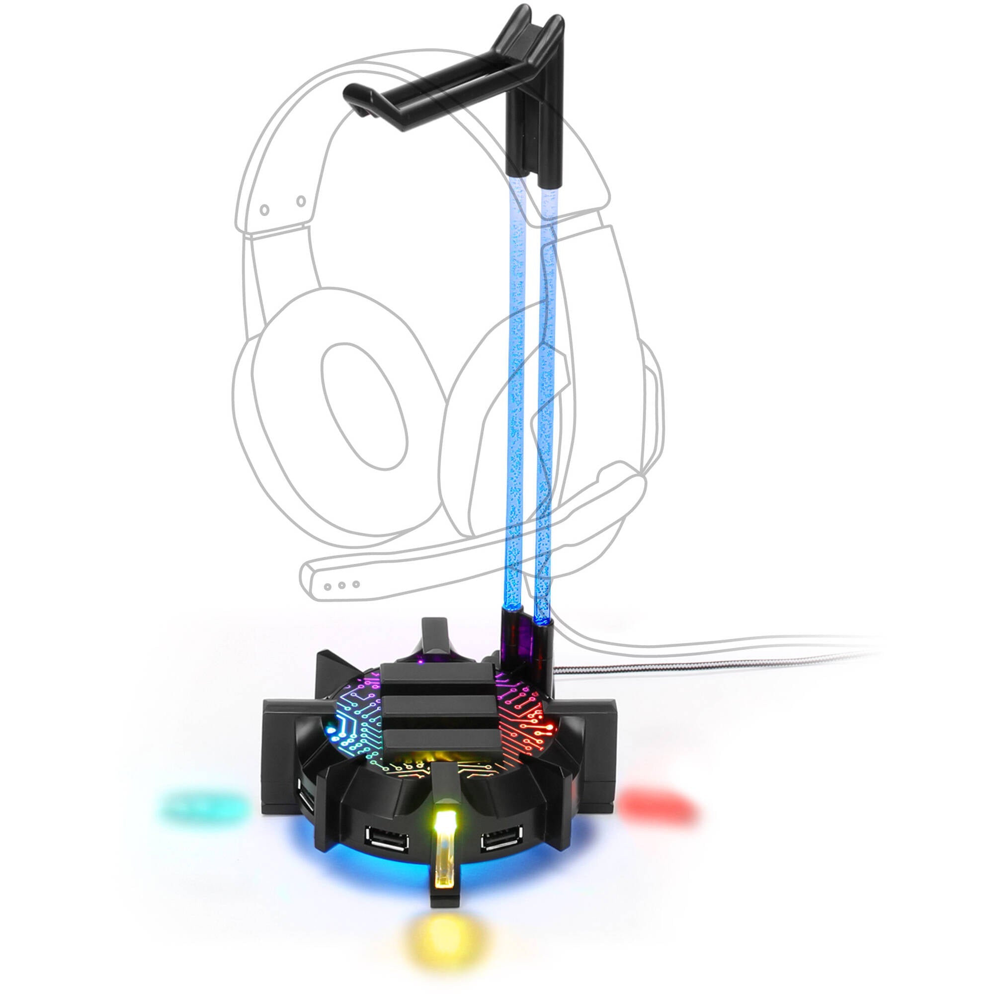 The Enhance Gaming Headset Stand and Gaming Hub has four USB ports and boasts a flexible transparent acrylic neck that responds to seven LED modes to match your gaming setup. The neck features non-slip rubberized feet, and a counterbalanced base that stabilizes heavier headsets. The four USB 2.0 ports transform the holder into a multi-use station to connect items like keyboards and gaming mice, while you can simply store your headset on the stand's hanger.