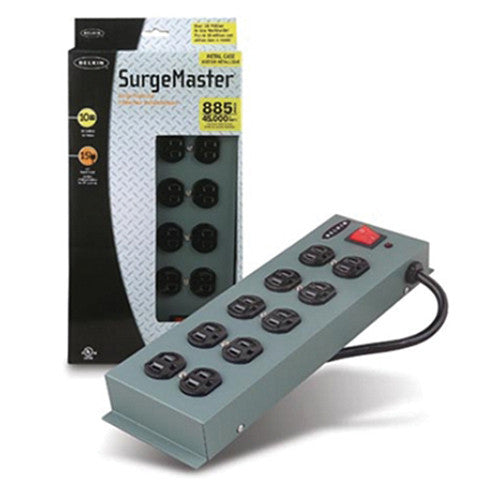 The Belkin 10-Socket Metal SurgeMaster is designed to protect equipment against power surges, lightning strikes and any other harmful electrical imbalances. The SurgeMaster features ten outlets and protects against power surges of up to 885 Joules in strength. Surges can occur between hot, neutral and ground lines; this unit protects along all three lines. An indicator lets you know when your equipment is protected at a glance. Additionally, the metal casing protects the interior circuitry of the surge protector against damage. The Belkin 10-Socket Metal SurgeMaster is backed by a lifetime warranty for peace of mind.