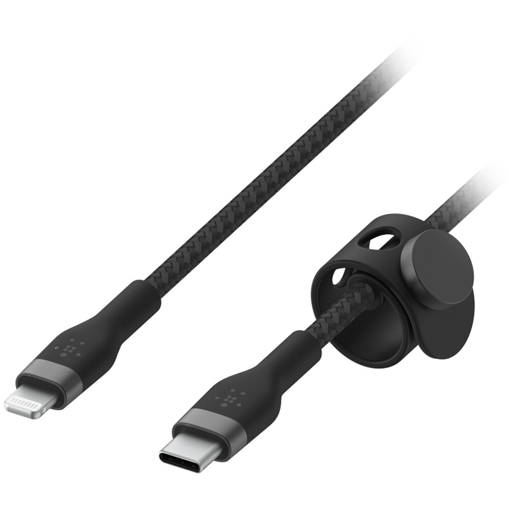 Engineered with braided silicone, the black Belkin BOOST CHARGE PRO Flex USB-C to Lightning Male Cable features a braided design for improved resistance to fraying. It comes with a magnetic cable management system and measures 9.8' long.