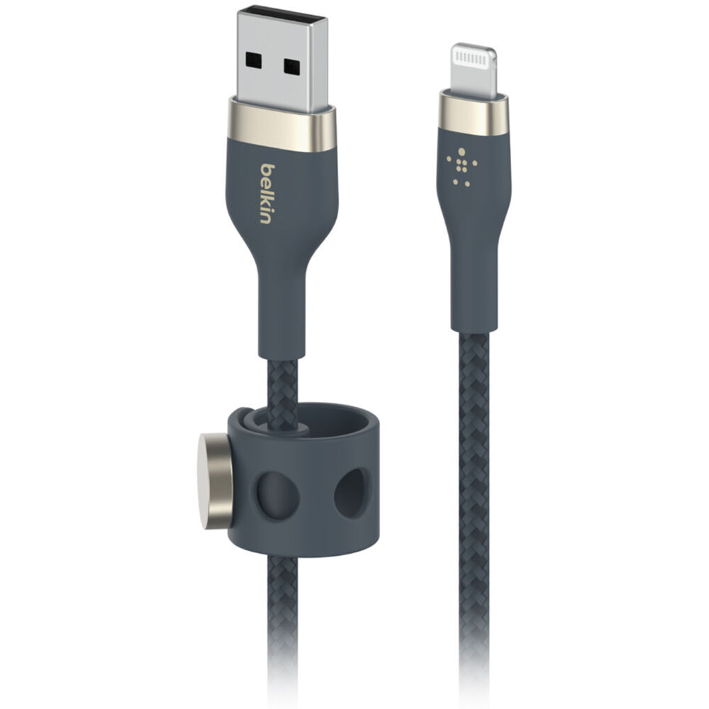 Keep your Lightning device connected with the 6.6' blue BOOST CHARGE PRO Flex USB Type-A to Lightning Cable from Belkin. Designed with a double-braided exterior and silicone construction, this cable provides up to 30 times the durability of standard cables. Use the included magnetic cable management system for hassle-free storage or deployment. MFI certified, this cable measures 6.6' long.
