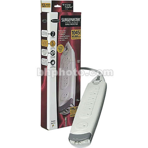 The Belkin Seven-Outlet SurgeMaster Surge Protector with Phone Protection delivers reliable electronics protection by equipping users with 1045 joules of energy rating, a 45,000 Amp maximum spike current, a 12-foot power cord, and seven three-prong outlets to fit several key appliances, including one with a large enough radius to fit an AC block plug.