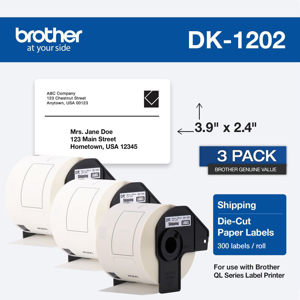 The DK1202 2.4 x 3.9" White Paper Shipping Labels from Brother features three rolls of 300 white paper shipping labels for use with Brother label printers.