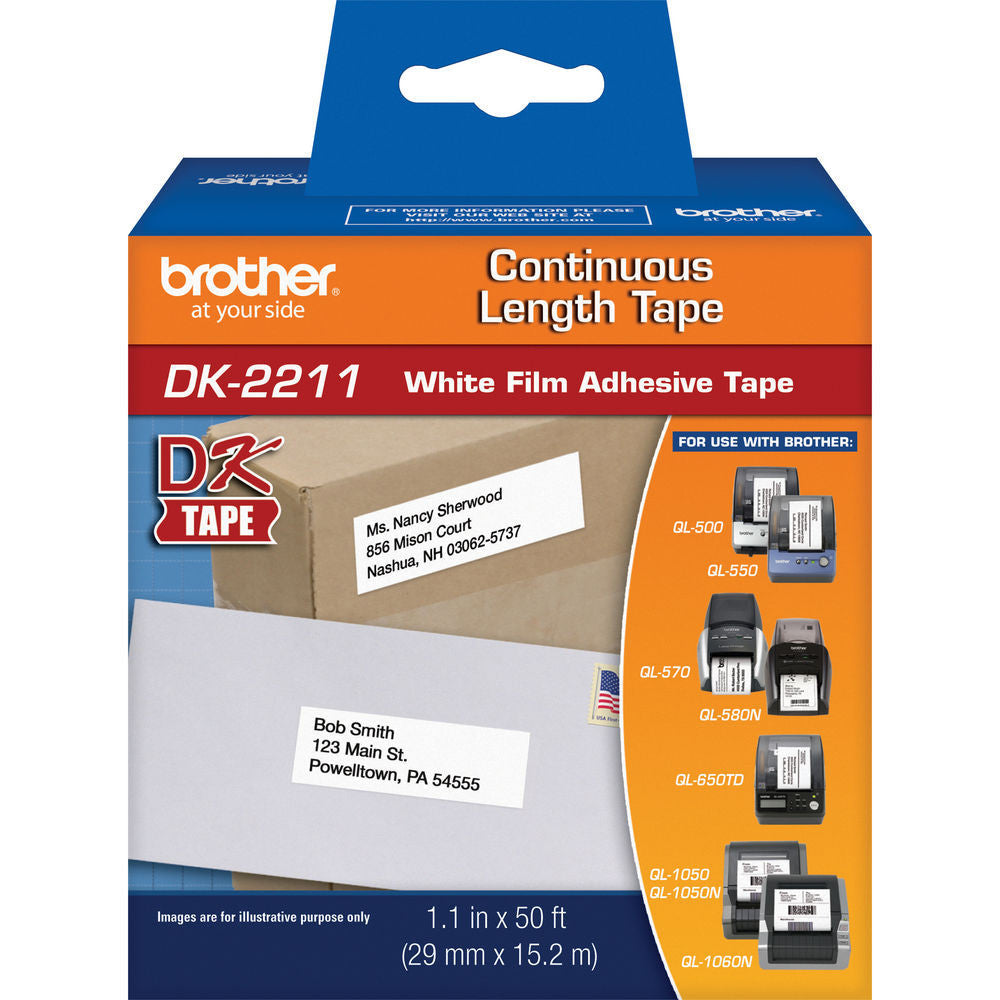 The Brother DK2211 1.1" (29 mm) Black Print On White Tape is 50' (15.2 m) long and is designed for the following models:
