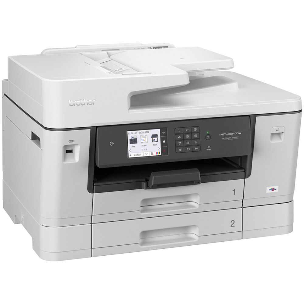 Fulfill your small workgroup's needs with a single unit with this wireless-capable MFC-J6940DW All-in-One Color Inkjet Printer from Brother. It offers printing, scanning, copying, and faxing at sizes up to 11 x 17". The core printing features include a high 4800 x 1200 dpi resolution, the ability to handle documents up to 11 x 17", automatic duplexing, and print speeds up to 28 ppm. This, combined with built-in Wi-Fi with NFC, allows for easy connection and the ability to work directly from a mobile device.