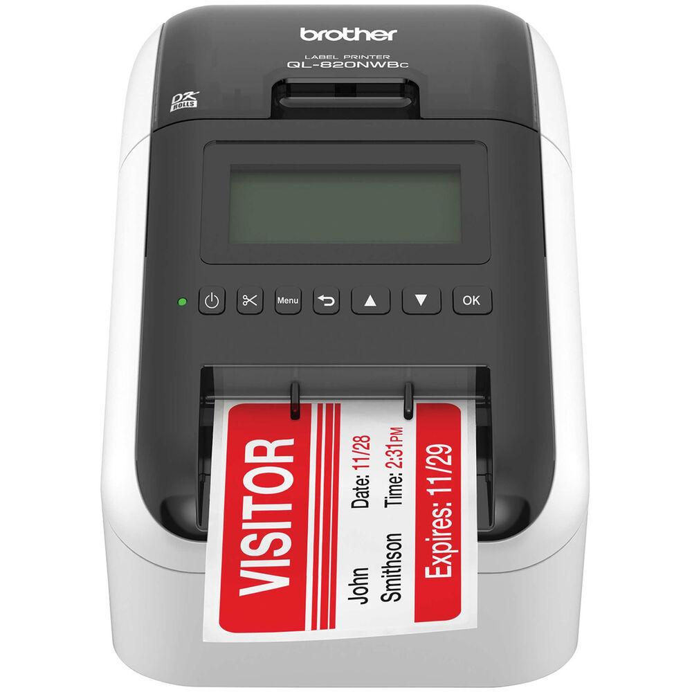 With the Brother QL-820NWBC High-Speed Professional Wireless Label Printer, you'll be able to print black/red labels using DK-2251 or cost-effective paper labels for packages, envelopes, file folders, name badges, postage, and more. Print up to 110 standard address labels per minute with black text at 300 x 600 dpi. The printer offers flexible connectivity with Bluetooth, Ethernet, and Wi-Fi interfaces. It also features a USB Host interface, allowing you to connect a compatible peripheral, such as a scanner (sold separately). With Brother's network management tools, it's easy to integrate and manage any network. Create and print labels from your mobile device when connected to a wireless network via AirPrint and Brother iPrint&Label. The free Brother iPrint&Label app works with your Apple iPhone, iPad, iPod touch, as well as Android mobile devices, so you can quickly access and print label templates. You can also use the app to create your own custom labels with graphics and photos. The printer is also easy to integrate with free software development kits. The backlit monochrome LCD screen allows for a completely portable, standalone label printer, when adding an optional lithium-ion battery. This printer uses genuine DK drop in labeling supplies and does not need ink or toner. It is compatible with both Windows and Mac systems.