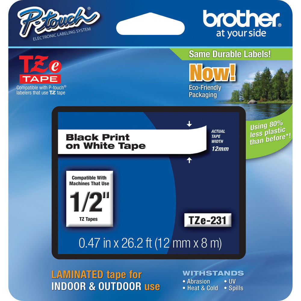 The black on white TZe231 Laminated Tape for P-Touch Labelers measures 0.47" x 26.2' and features their standard adhesive. The tape is ideal for everyday applications, normal indoor and outdoor conditions, and works best on smooth, flat surfaces. The tape is designed for the following label printers:
