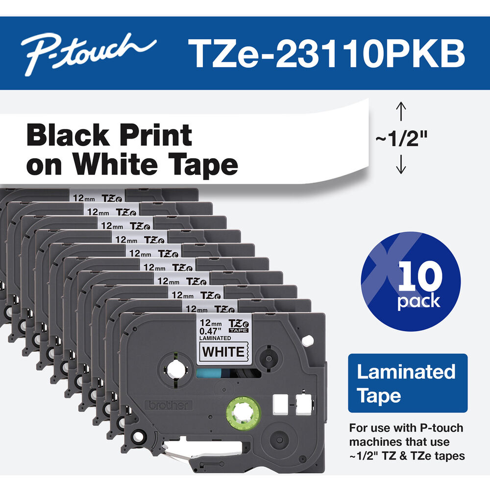 This 10-pack of black-on-white TZe231 Laminated Tape for P-Touch Labelers measures 1/2" x 26.2' and features their standard adhesive. The tape is ideal for everyday applications, normal indoor and outdoor conditions, and works best on smooth, flat surfaces. The tape is designed for the following label printers:
