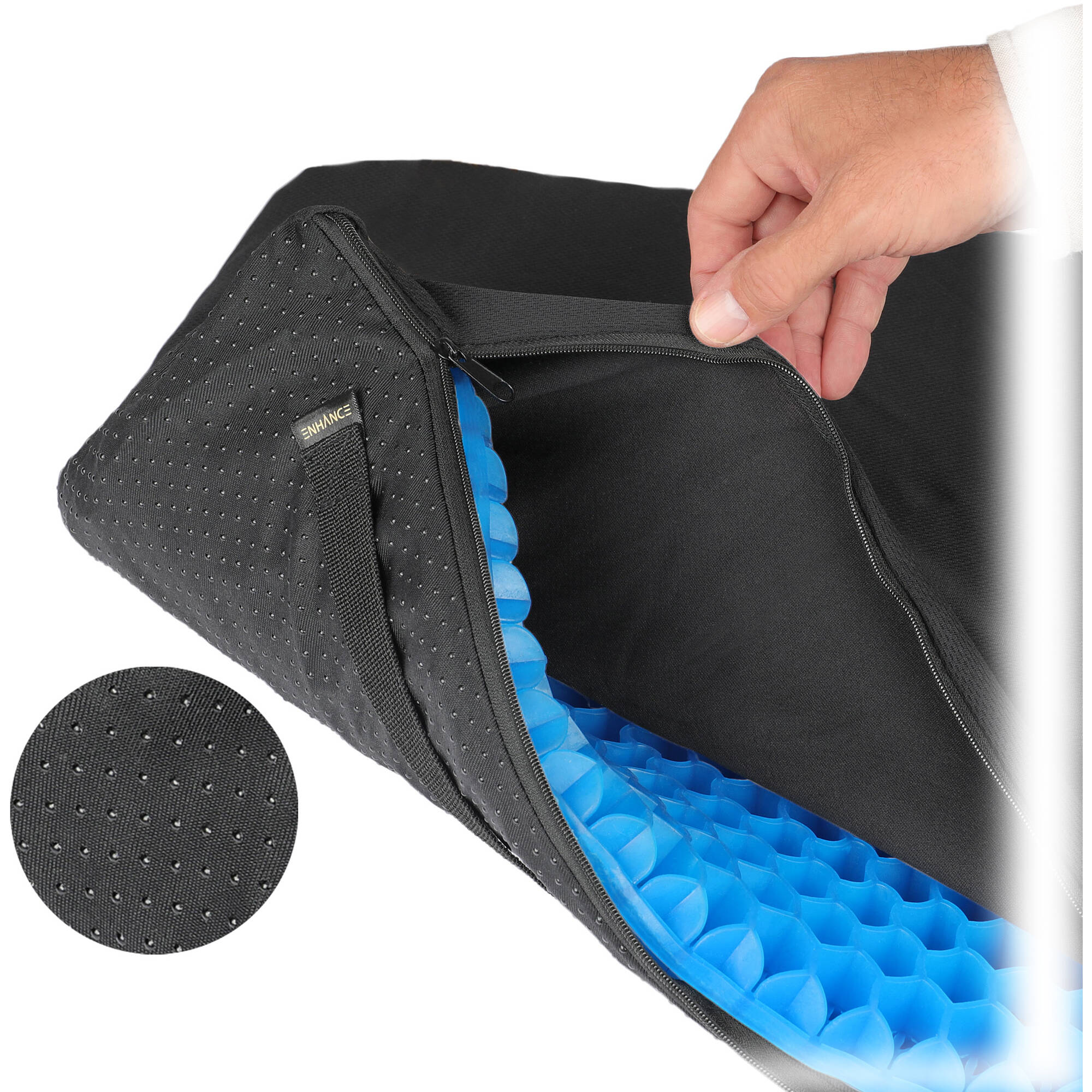 The Enhance Gel Chair Seat Cushion increases your comfort when you're sitting on an office chair, gaming chair, plane, or stadium bench. Made with an ultra-flexible polymer gel, the seat cushion conforms to your body, absorbing and relieving those painful pressure points. The double-layer honeycomb design disperses body weight and allows air to circulate through the seat cushion, helping it stay cool. Unlike memory foam seat cushions that accumulate heat, the polymer gel and its honeycomb design, combined with the breathable, moisture-wicking spandex cover, circulates air and works to keep the cushion cool and dry. The cushion measures 17.1 x 17.5 x 1.4".