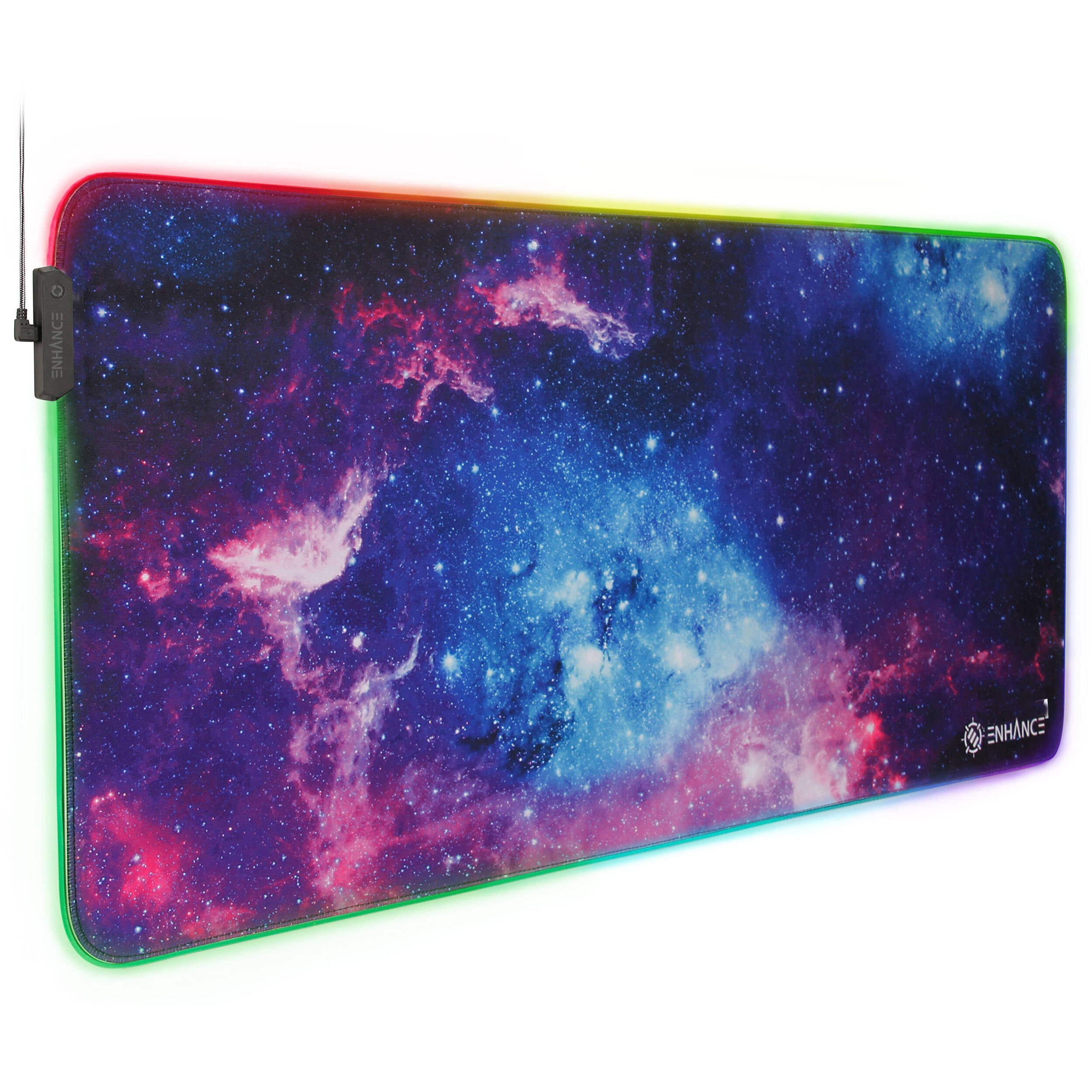 The galaxy-colored Enhance Illuminated 3XL Computer Desk Mat has illuminated edges accessed with a single button that provides seven monochromatic colors as well as color changing, RGB shifting, and RGB wave modes. The mat's clear, water-resistant optical surface provides commendable illumination, while its 0.15" cushion provides comfort. Its nonskid natural rubber base prevents movement for a secure grip, while the finely textured cloth surface provides medium mouse speed control with excellent tracking.