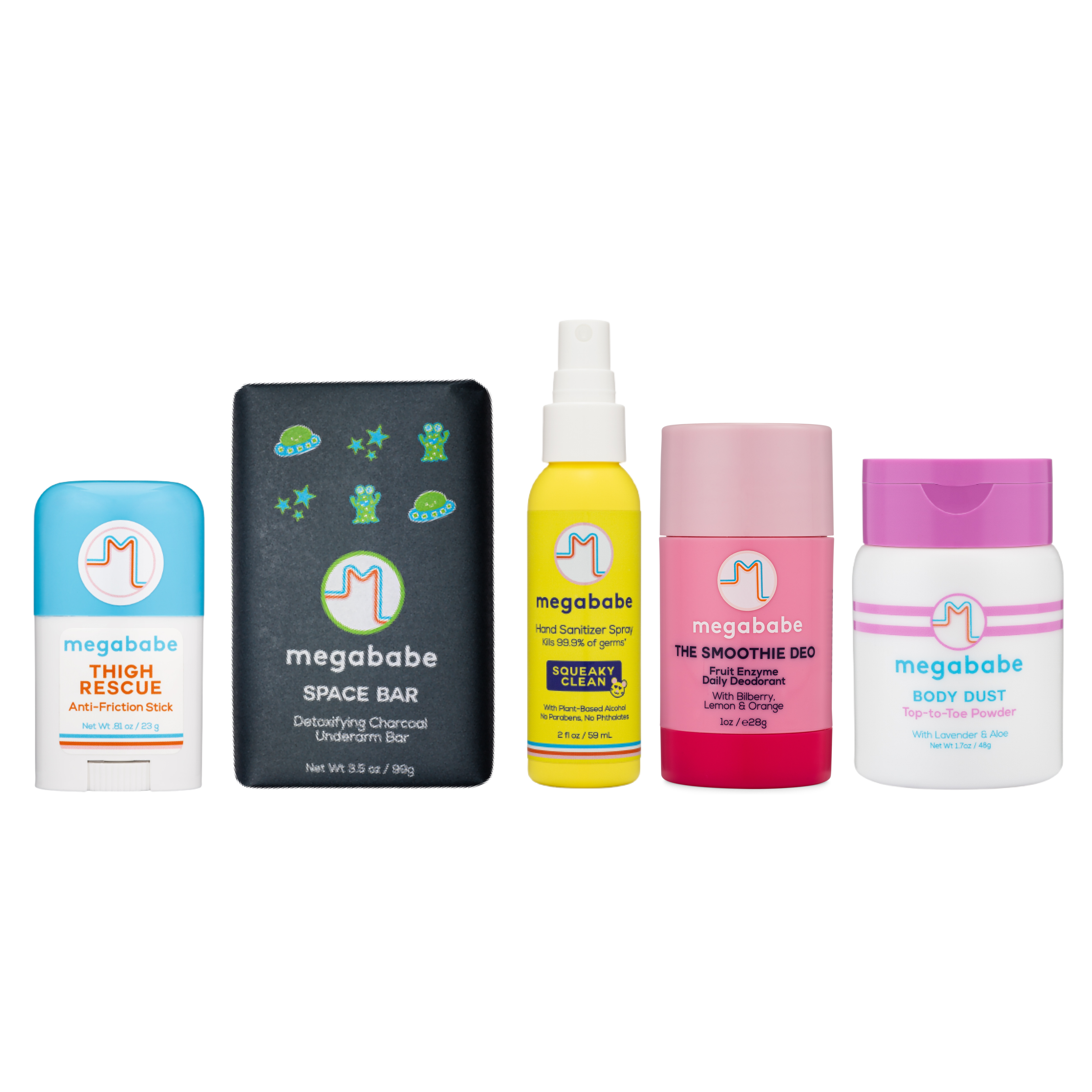 Set includes: 0.81 oz Thigh Rescue Mini, 3.5oz Space Bar, 2 fl oz Squeaky Clean Sanitizer Spray, 1 oz Smoothie Deo Mini, 1.7oz Body Dust Mini