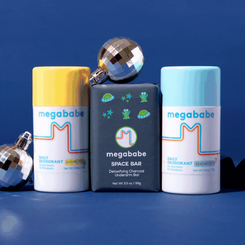 Set includes: 3.5 oz Space Bar Charcoal Underarm Bar, Choice of 2 of the following: 2.6 oz The Smoothie Deo, The Green Deo, The Geo Deo, The Glow Deo, The Cream Deo, Rosy Pits, Sunny Pits, Beachy Pits, Soapy Pits
