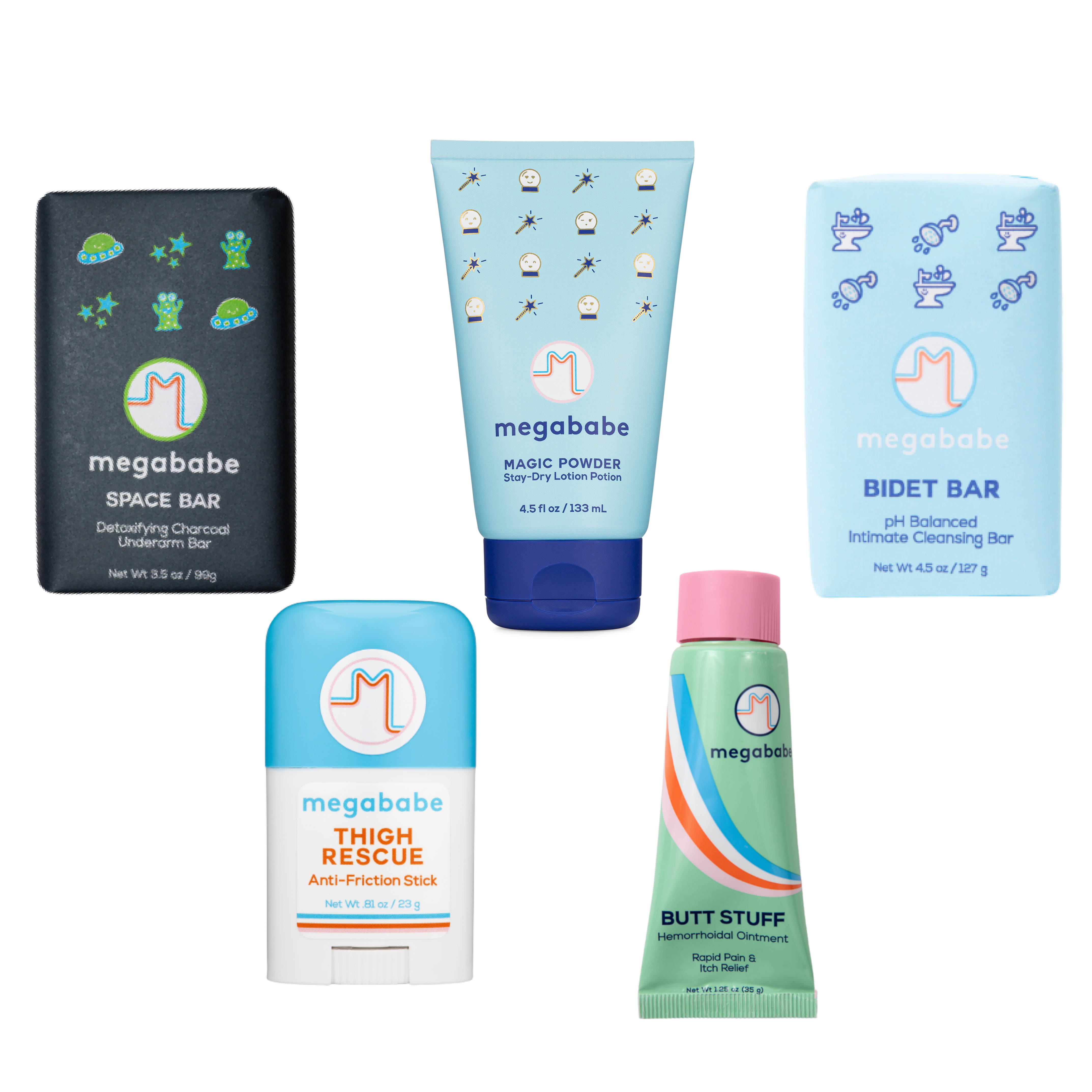 Set includes: 3.5 oz Space Bar, 4.5 fl oz Magic Powder Stay-Dry Lotion Potion, 0.81 oz Thigh Rescue Mini, 1.25 oz Butt Stuff, 4.5 oz Bidet Bar