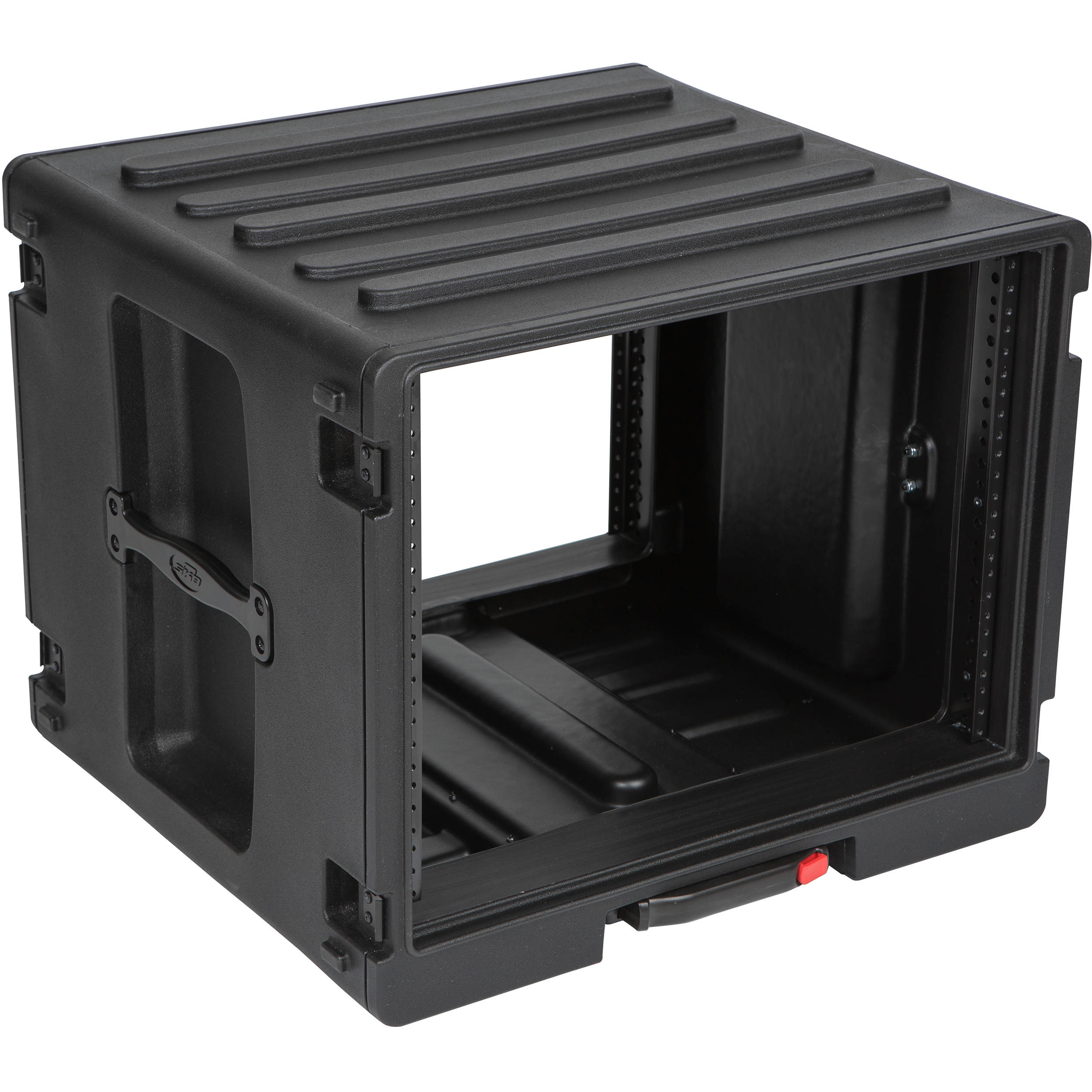 The SKB 1SKB-R8UW is a 8 RU roto rolling rack case designed to house rack-mountable equipment for musicians and audio engineers in studios, live stage applications, and mobile-recording setups. It features threaded steel rails in the front and back and a waterproof gasket to keep your gear dry. The rear access door allows easy configuration of your equipment's rear-panel connectors and switches. Military-grade butterfly latches provide dependable and secure closure.