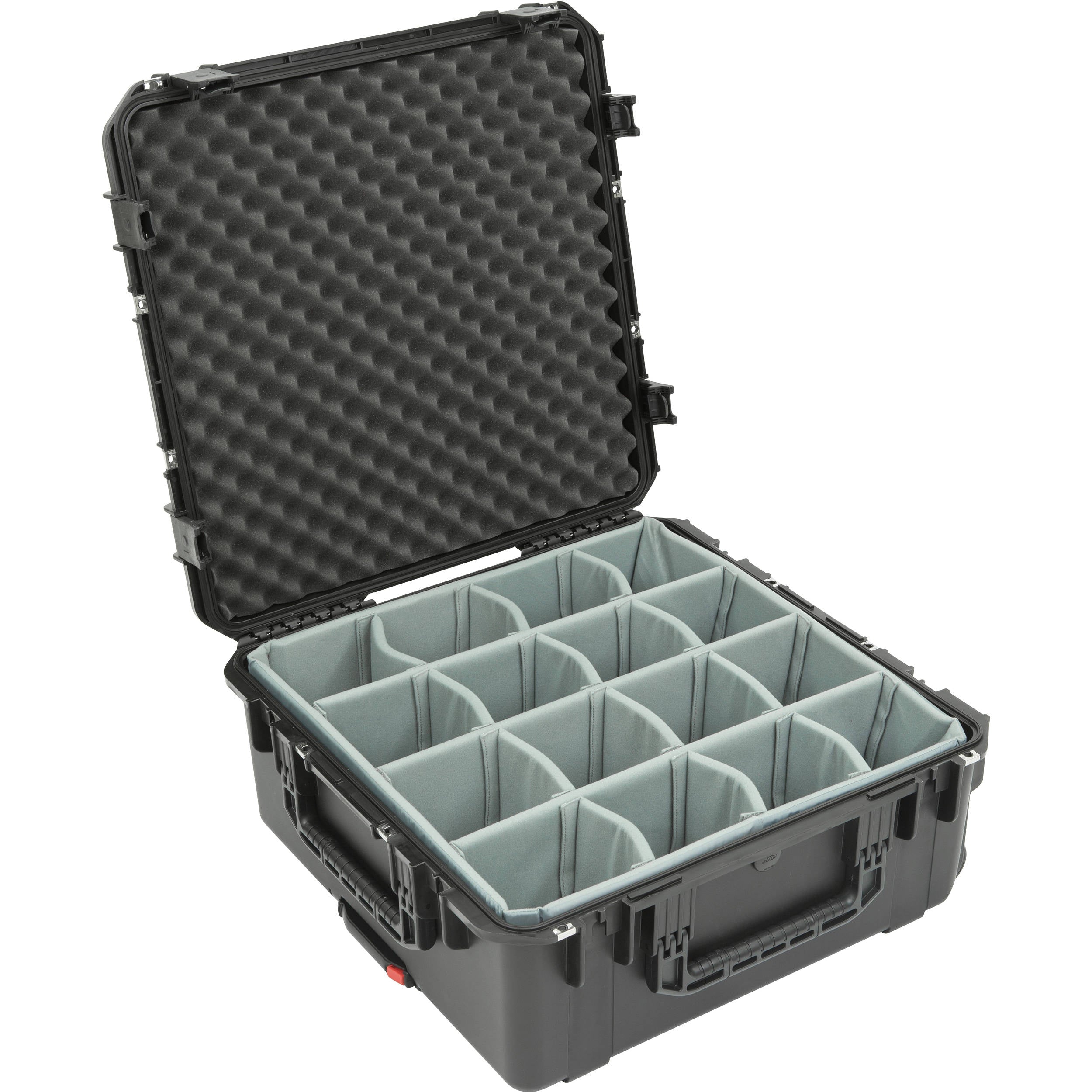 Store, transport, and protect your gear with the black 2424-10 Wheeled Case with Think Tank Designed Dividers from SKB . The case features a built-in purge valve, a trolley handle, wheels, a latch closure, and large handles.