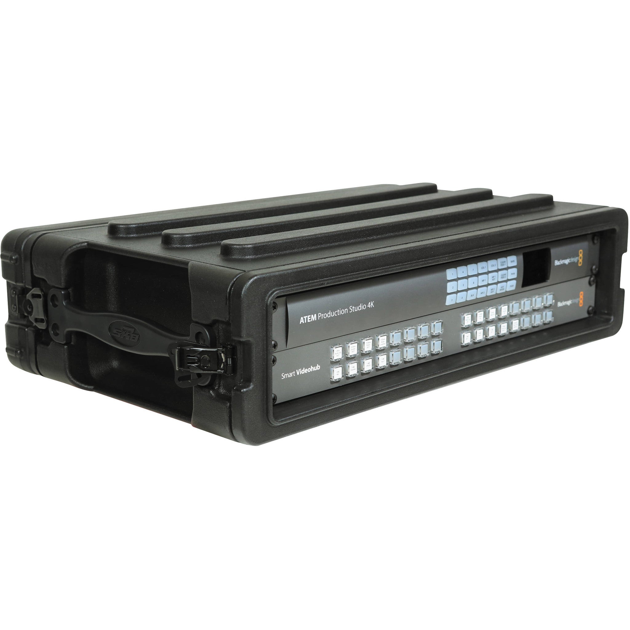 The black 2U Roto Shallow Rack Case with Steel Rails from SKB is a rotationally-molded shallow rack case with multiple applications, including holding equipment such as computers or music players which are "rack-able" or which can be screwed into the case. This case has steel front and rear threaded rails with a rail-to-rail depth of 10.7" and two vertical rack units. There is a water-resistant gasket in the lid and a side grip handle.