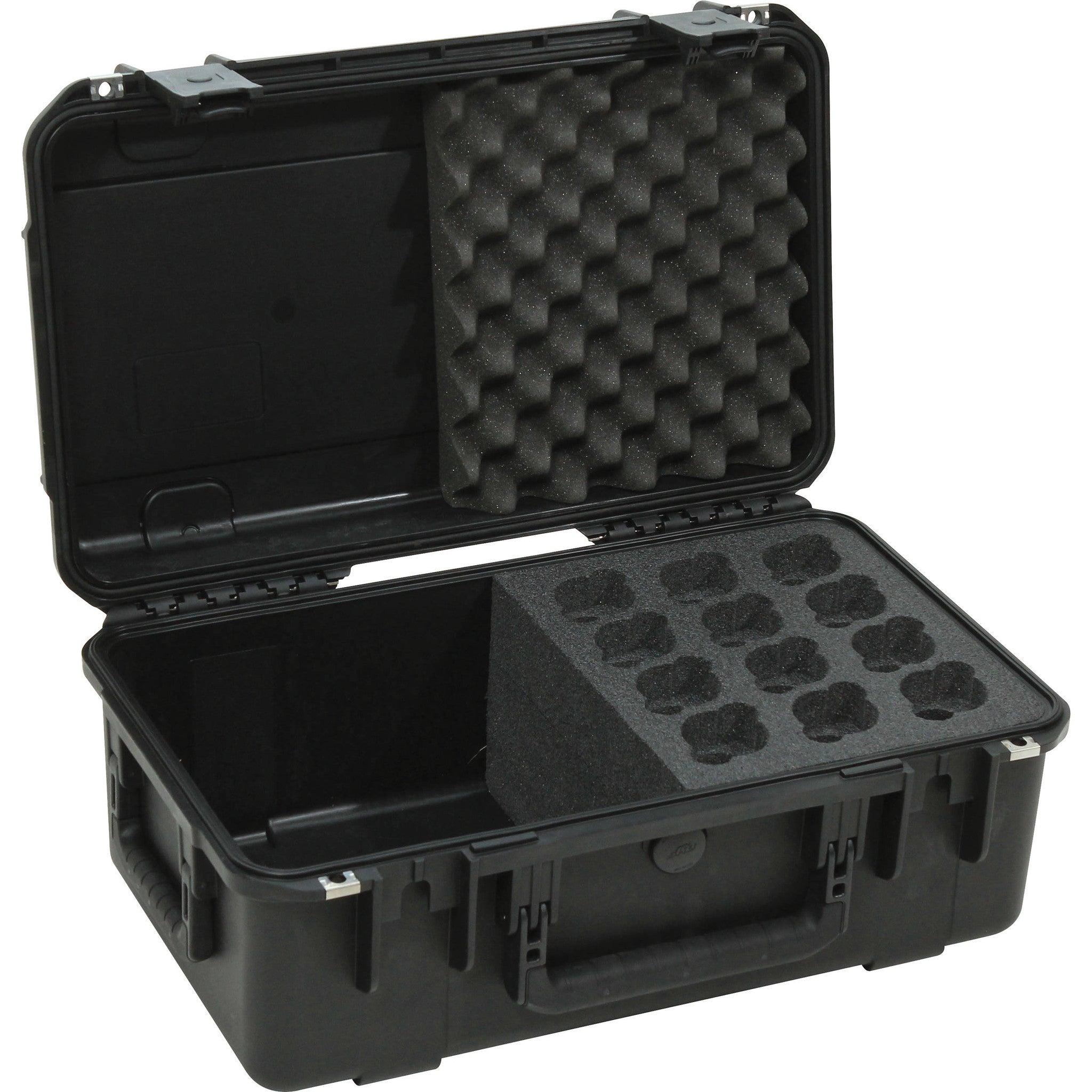 The SKB 3I-2011-MC12 iSeries Case for 12-Mics & Cables is a microphone case that holds 12 microphones stored vertically and is part of the iSeries waterproof case line. The microphone holes are designed to secure popular types of handheld microphones, finger cutouts that provide instant access, and a generous storage compartment for cables and microphone clips. The interior is made of high quality PE foam.