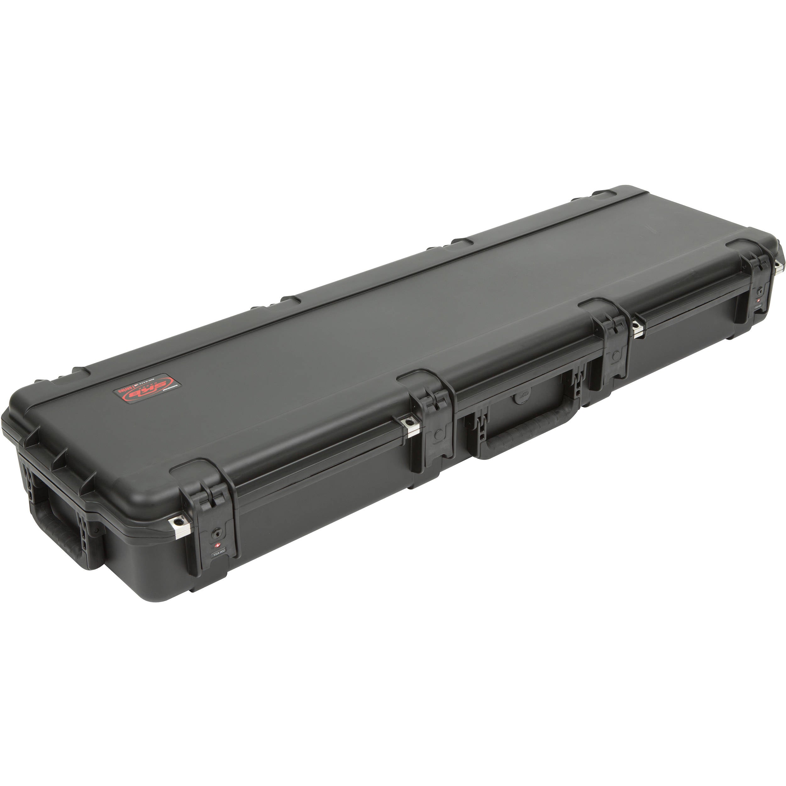The narrow SKB 3i-5014-TKBD iSeries 76-Note Keyboard Case is constructed from an injected mold of ultra-high-strength polypropylene copolymer resin and features a gasket seal, making it waterproof and resistant to UV, solvents, corrosion, fungus, and impacts. The military-grade case features a fully customizable Think Tank-designed interior with a total of 16 repositionable, hook-and-loop-covered, foam pads in four sizes for a customizable, snug fit. The exterior features a molded-in hinge, patented trigger-release latch system, comfortable snap-down rubber-over-molded cushion grip handles, and an automatic pressure-equalization valve. Additionally, two integrated wheels are provided for ease in transport.