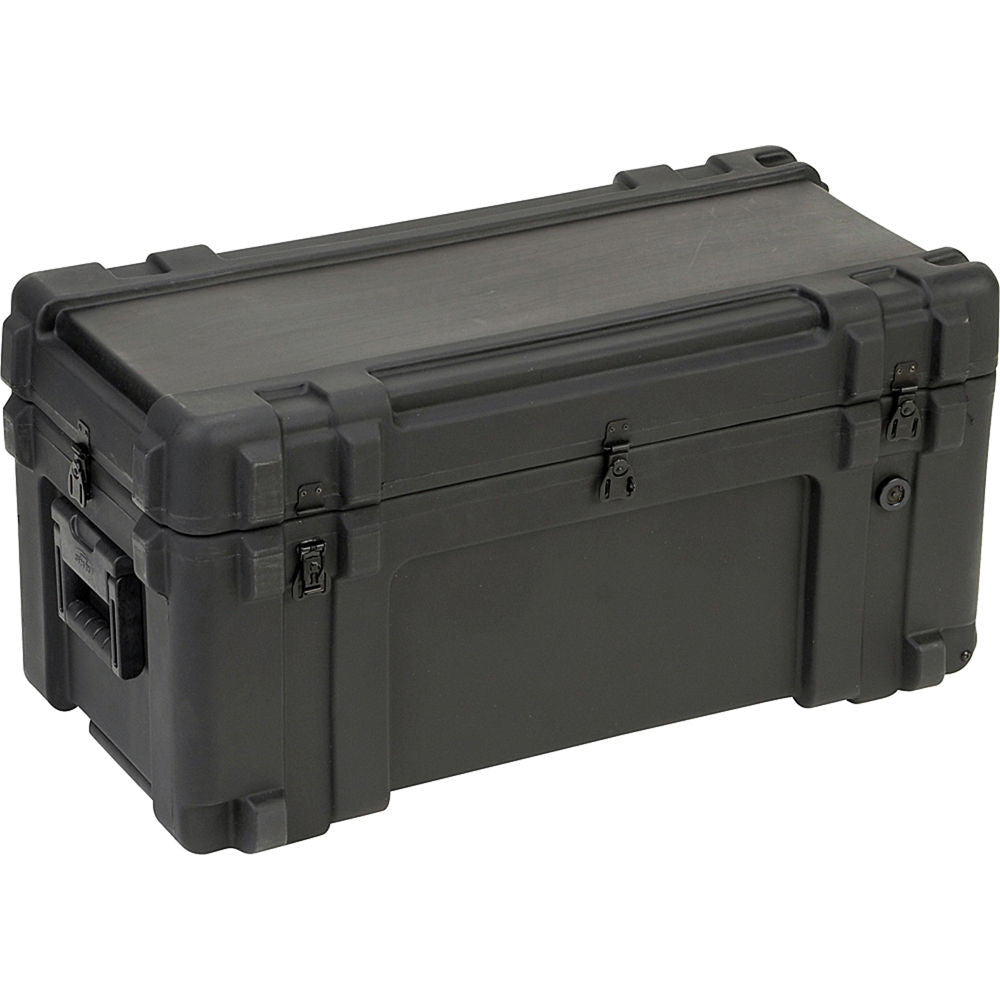 The SKB 3R3214-15B-CW Mil-Standard Utility Case is designed to meet the most demanding military specifications. The case is roto-molded for strength and durability with an LLPDE shell for maximum impact resistance. It is water proof with solid stainless steel latches and hinges that will withstand the most demanding shipping conditions and they are padlock lockable. This case has a retractable pull handle and built in wheels. This case has a cubed foam interior.