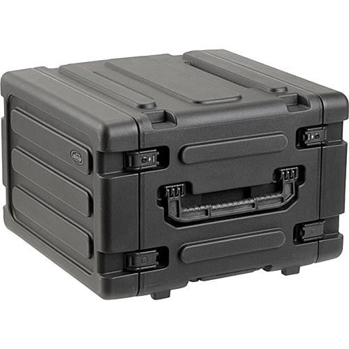 The SKB 3SKB-R06U20W 20" Deep 6U Roto Shockmount Rolling Rack (Black) is a roto molded, water-resistant polyethylene rack case. The case has built-in elastomeric shock absorbers with a load range of 40-150 lbs. There are butterfly latches and an ambient pressure relief valve. The case has threaded steel front rails and rear rails. The doors are fully usable even when racks are stacked together. The case is transported by oversized snap-down handles on each side, a low profile pull handle and built-in roller-blade wheels.