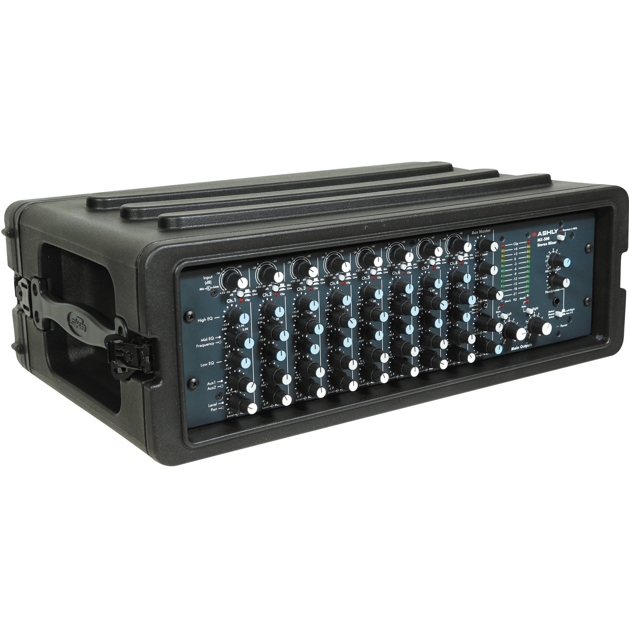 The black 3U Roto Shallow Rack Case with Steel Rails from SKB is a rotationally-molded shallow rack case with multiple applications, including holding equipment such as computers or music players which are "rack-able" or which can be screwed into the case. This case has steel front and rear threaded rails with a rail-to-rail depth of 10.7" and three vertical rack units. There is a water-resistant gasket in the lid and a side grip handle.