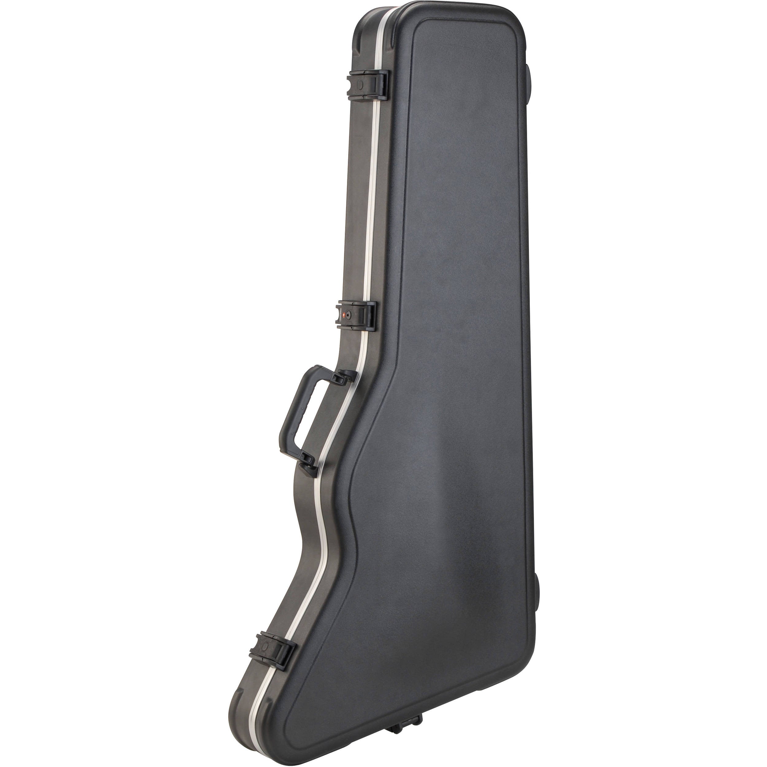 The Gibson Explorer/Firebird Hardshell Guitar Case by SKB is designed for "pointy style" guitars including the Gibson Firebird and Explorer, Jackson Kelly, and Jackson Warrior models. With full length neck support and an EPS foam interior this case keeps the instrument from rattling during transport. The case's exterior is made from ABS polymer and features valance support, 2 injection molded feet, and an over-molded carrying handle. The nylon trigger release latches are recognized and accepted by the TSA.