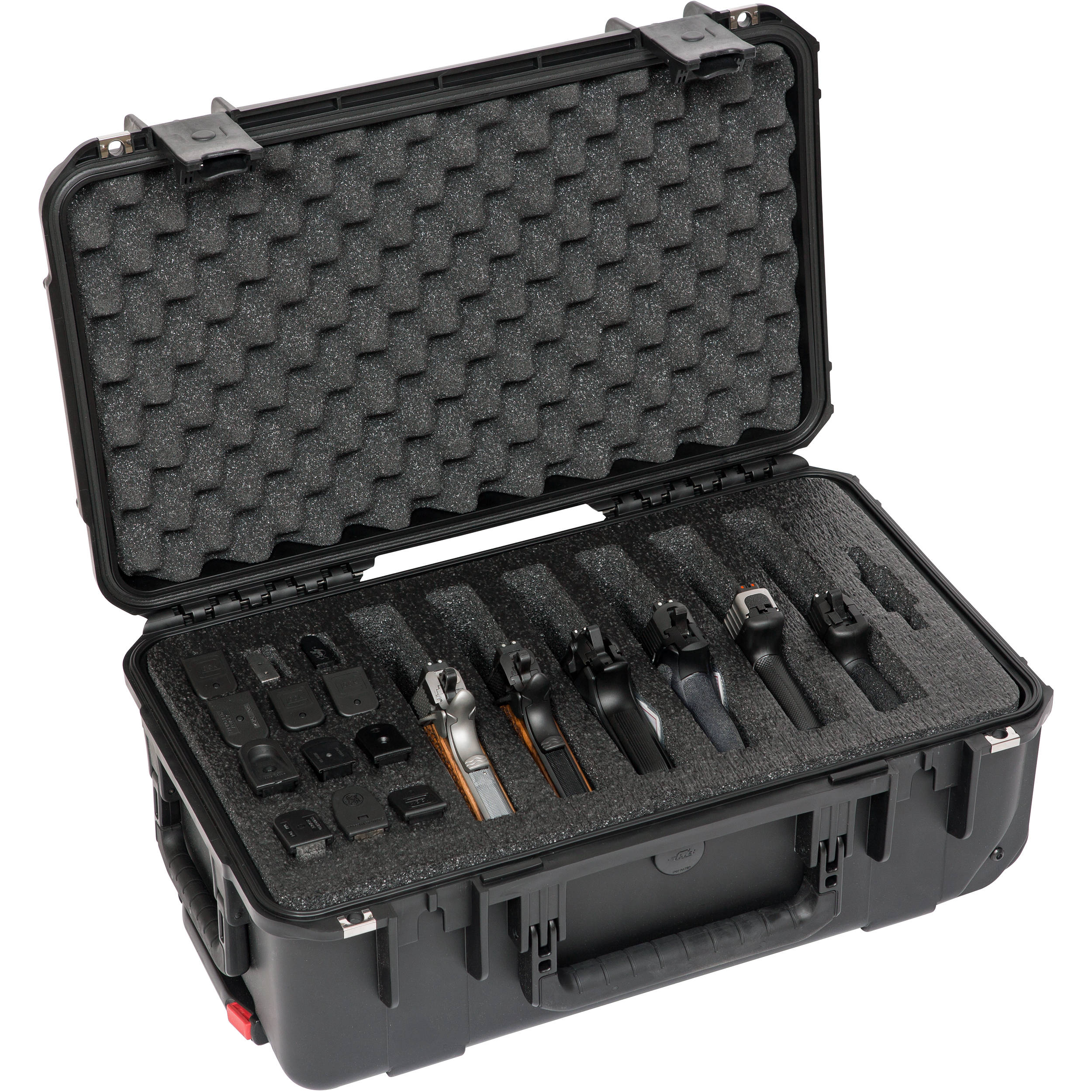 Store, transport, and protect up to six handguns and 12 magazines with the made-in-the-USA, black iSeries 2011-7 Six Handgun Case from SKB . The number of handguns and magazines/accessories may vary somewhat based on specific sizes. Users will appreciate the waterproof and dust-tight construction, custom-cut foam, molded-in hinge, and pressure equalization valve. For security, the case offers latch closure and metal hasps for optional padlocks.