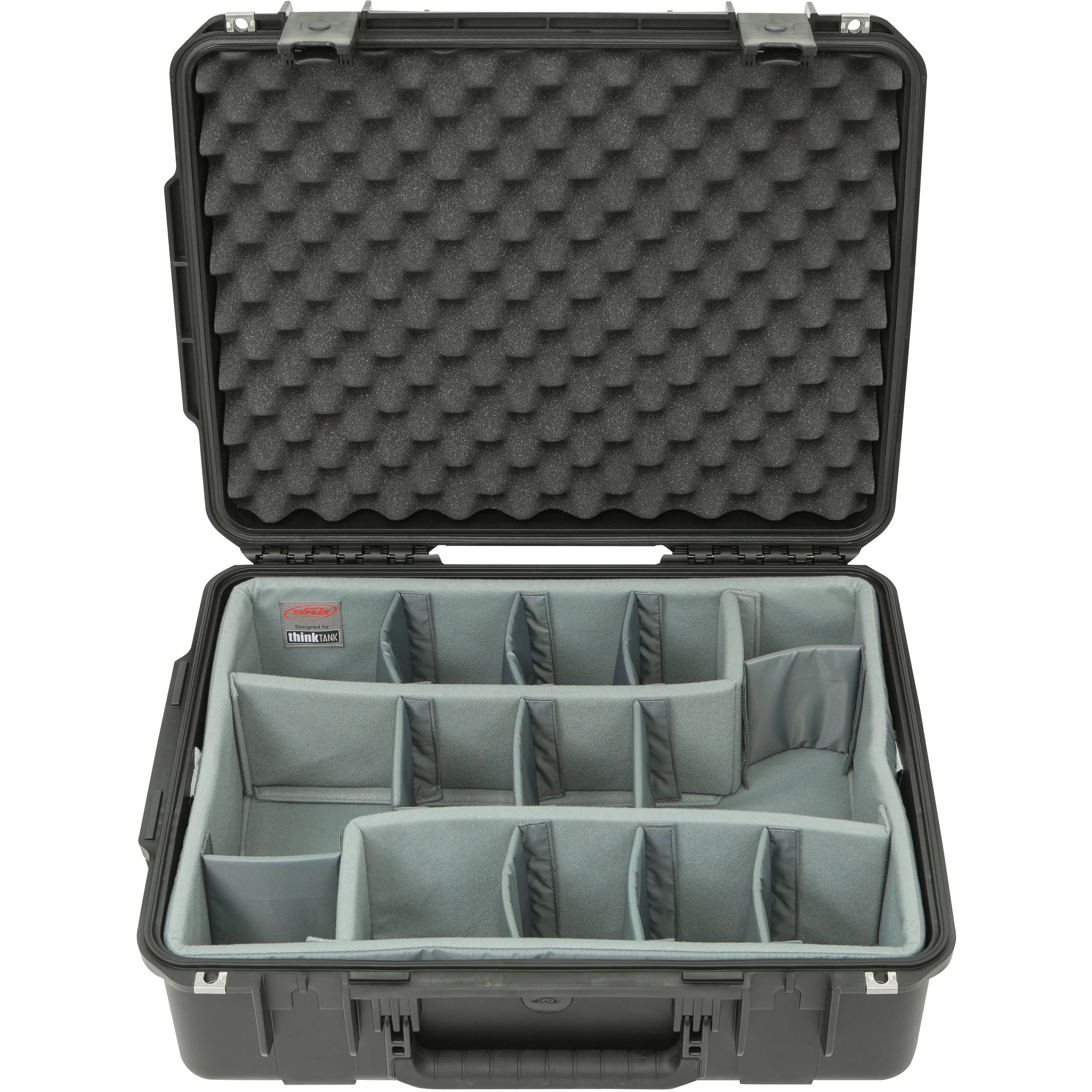 Store, transport, and protect two cameras, up to seven lenses, and related accessories with the watertight, dustproof, molded SKB iSeries 2015-7 Case with Think Tank-Designed Photo Dividers & Lid Foam . The black case features two trigger latches, two metal-reinforced locking loops for optional padlocks, an automatic ambient pressure-equalization valve, and top and side handles. For added protection there's a thick layer of convoluted foam under the lid.