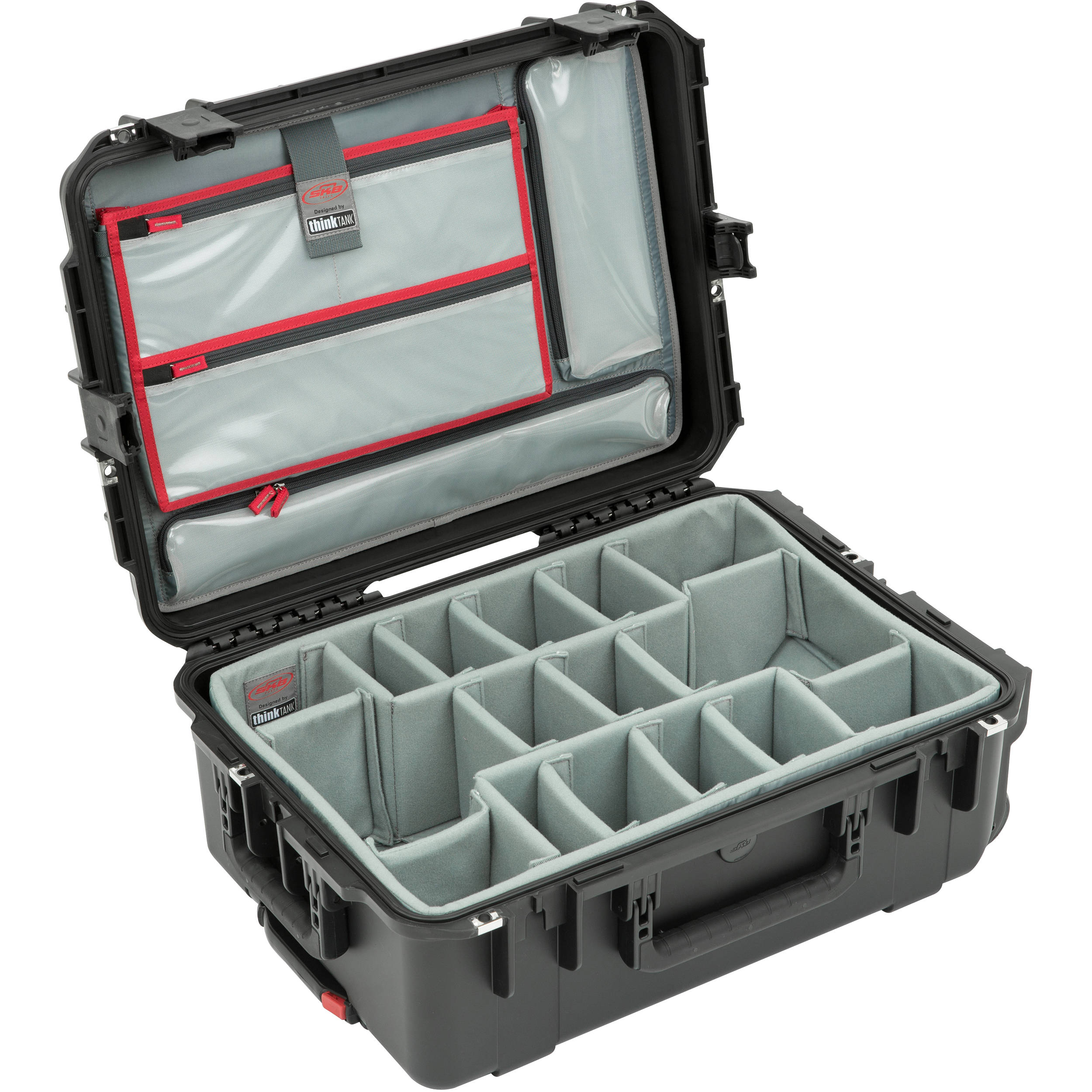 Store, transport, and protect your valuable gear in this black iSeries 2215-8 Waterproof Utility Case with Wheels, Think Tank Designed Photo Dividers, and Lid Organizer from SKB Cases. The case is dust and waterproof, has ultra-high-impact polymer construction, ABS double-throw latches, and a built-in purge valve. Carry the case with the large folding handles or roll it with the retractable extension handle and in-line skate-style wheels.