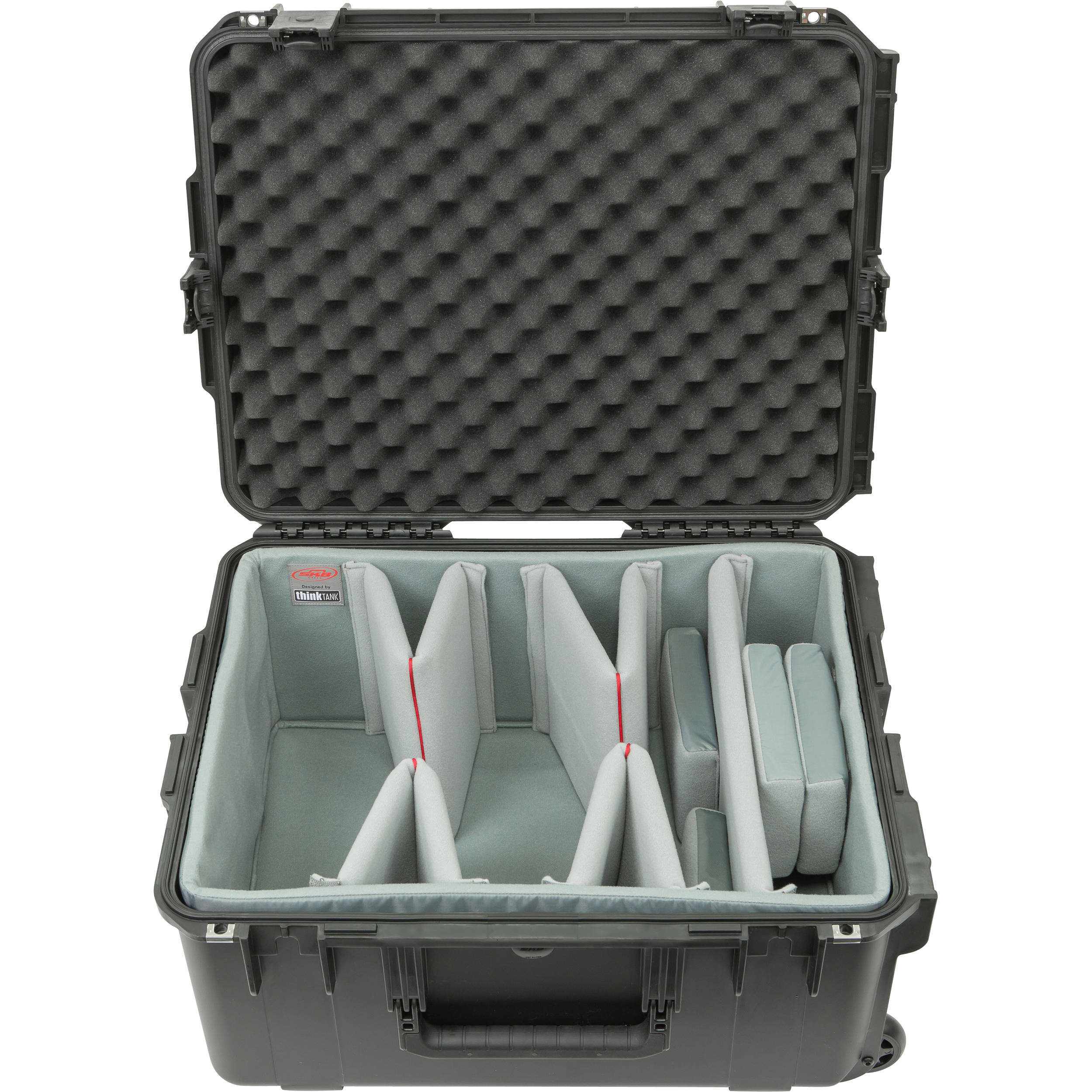 Store, transport, and protect select video camera, lens, and related accessories with the watertight, dustproof, molded SKB iSeries 2217-10 Case with Think Tank-Designed Video Dividers & Lid Foam . The black case features two trigger latches, two metal-reinforced locking loops for optional padlocks, an automatic ambient pressure-equalization valve, three over-sized handles and a trolley handle with wheels. For added protection there's a thick layer of convoluted foam under the lid.