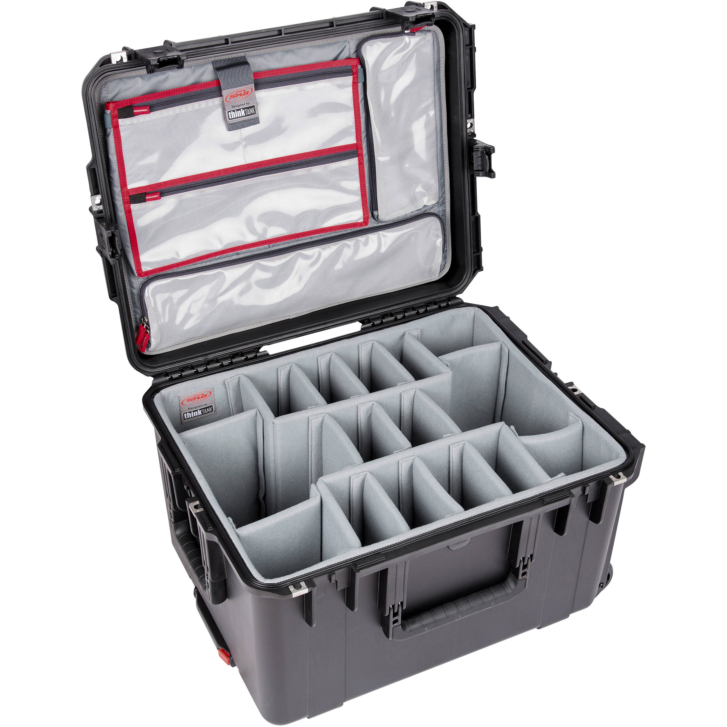 Store, transport, and protect two cameras, up to seven lenses, and related accessories with the watertight, dustproof, molded SKB iSeries 2217-12 Case with Think Tank Photo Dividers & Lid Organizer . The black case features two trigger latches, two metal-reinforced locking loops for optional padlocks, an automatic ambient pressure-equalization valve, three over-sized handles and a trolley handle with wheels. Under the lid is an organizer with three zippered clear mesh pockets, a large zippered side pocket, and a polyester-lined iPad/laptop top-loading pocket. The lid organizer is attached with touch-fastening fabric.