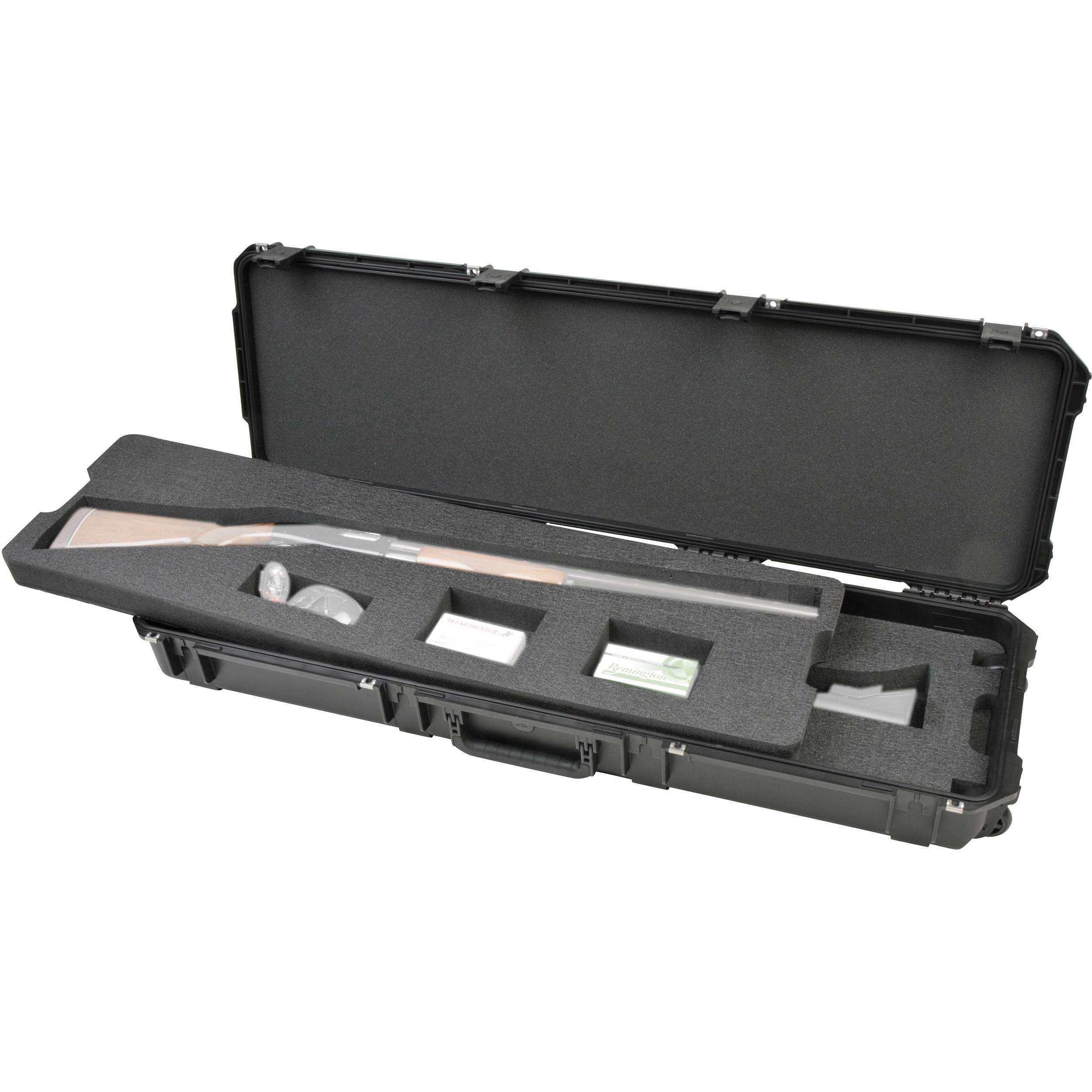 The black iSeries 3-Gun Competition Case from SKB features a custom foam insert to allow for carrying up to 3 guns in one convenient case. The interior of this case is made up of 2 lb density closed-cell foam and a reinforced rigid multi-layer divider for additional cushioning and secure transport. The case can accommodate shotguns of up to 48" long, scoped rifles of up to 39" long, and contains an adjustable foam cutout for shorter length guns. There are also six accessory compartments for shells, eye and ear protection, or a cleaning cloth.