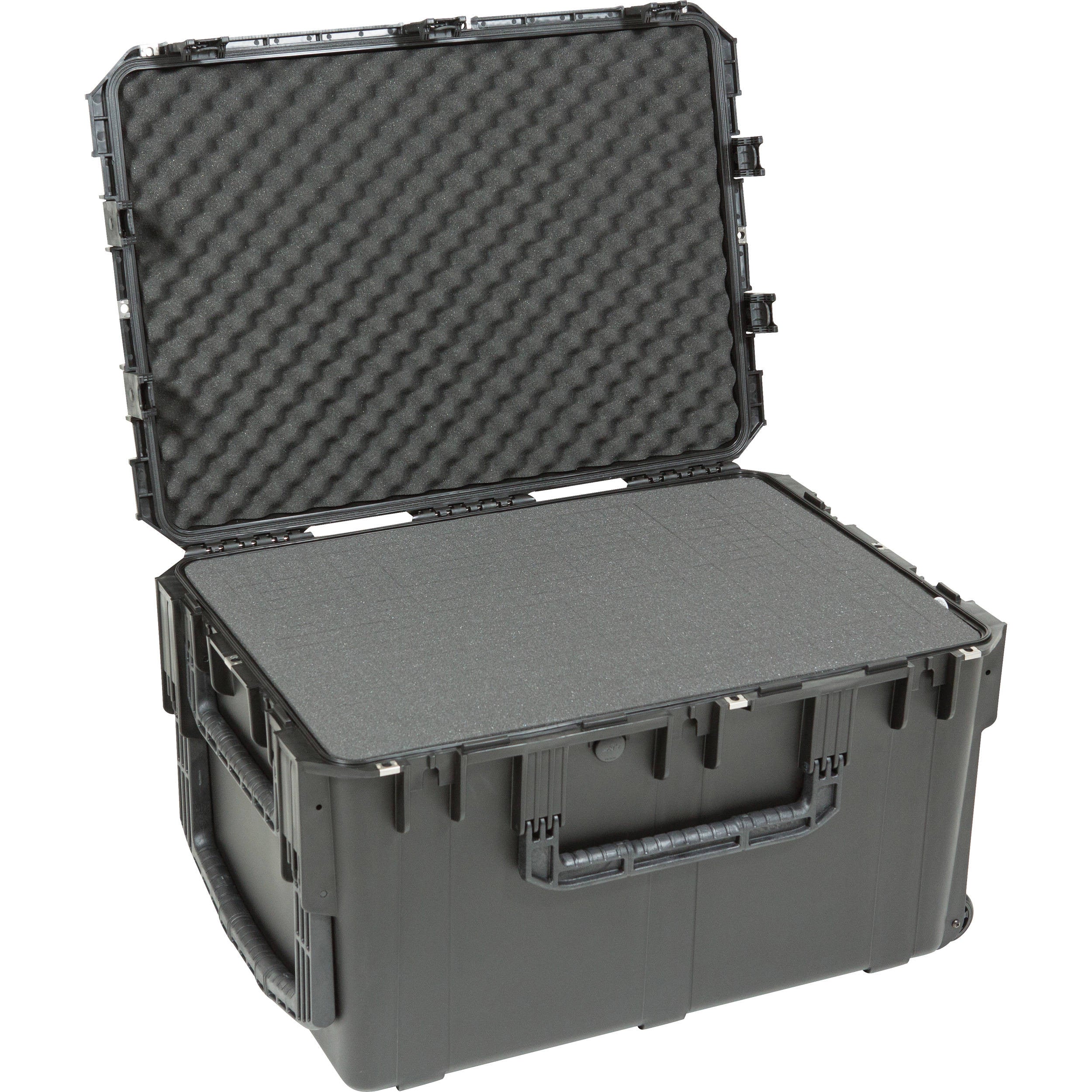 Transporting the case is possible with three snap-down over-molded grip handles and one two handle which helps when using the four in-line skate-style wheels. Additionally, the padlock holes come with stainless steel protector clips and the cubed foam lets you customize the interior for your items.