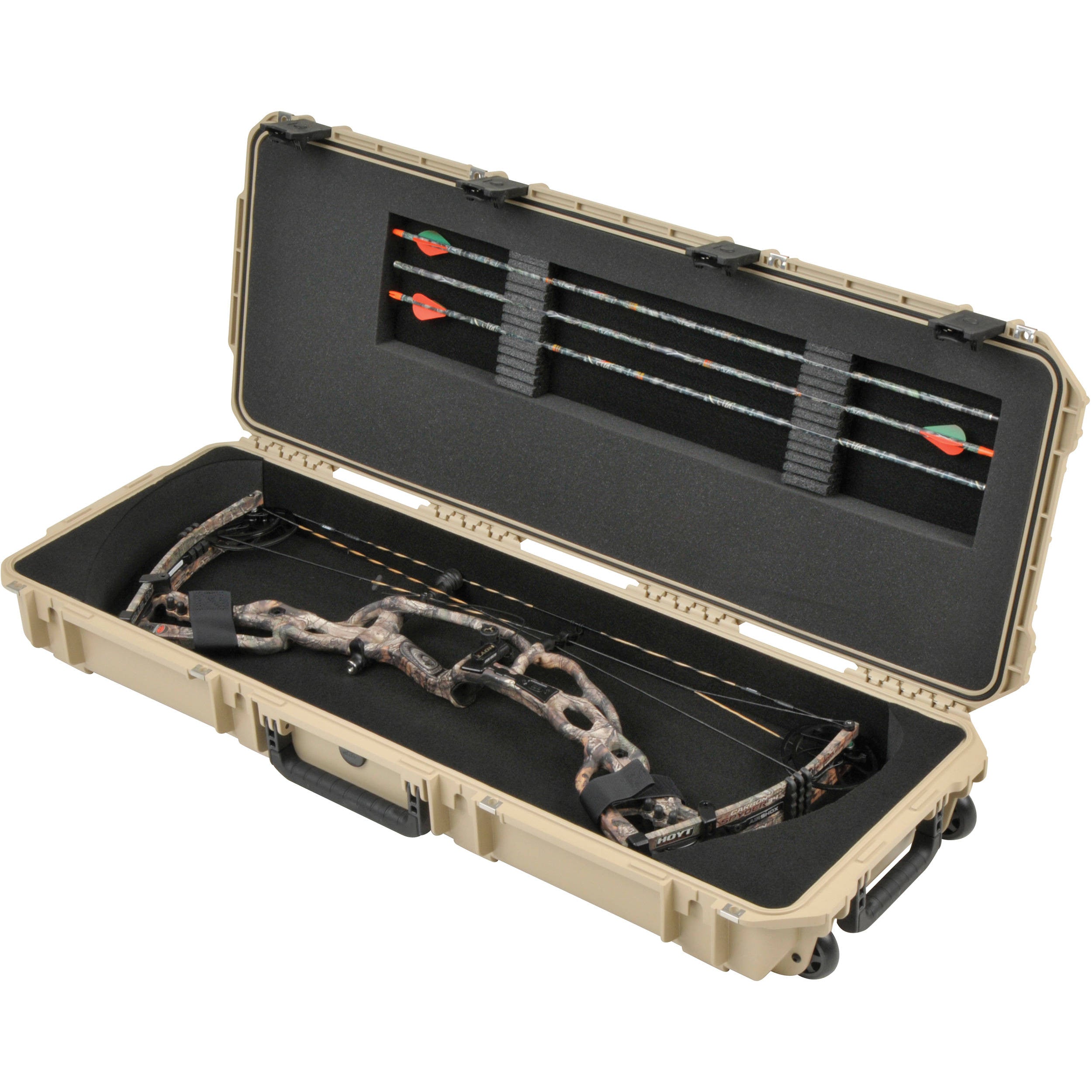 The desert tan iSeries 4214 Parallel Limb Bow Case is designed to hold most medium-sized parallel limb style bows. This impact-resistant case is made from injection-molded polypropylene copolymer resin to be resistant to UV radiation, solvents, corrosion, and fungi according to MIL-STD-810F standards; and it is gasket-sealed to make it dustproof and waterproof. Molded-in hinges, patented trigger release latches, and padlock holes with stainless steel protector clips add to the security of the case. Cushion grip handles on three sides for comfortable lifting and carrying, and in-line skate style wheels on the side allow it to be pulled along the ground when the case is packed.
