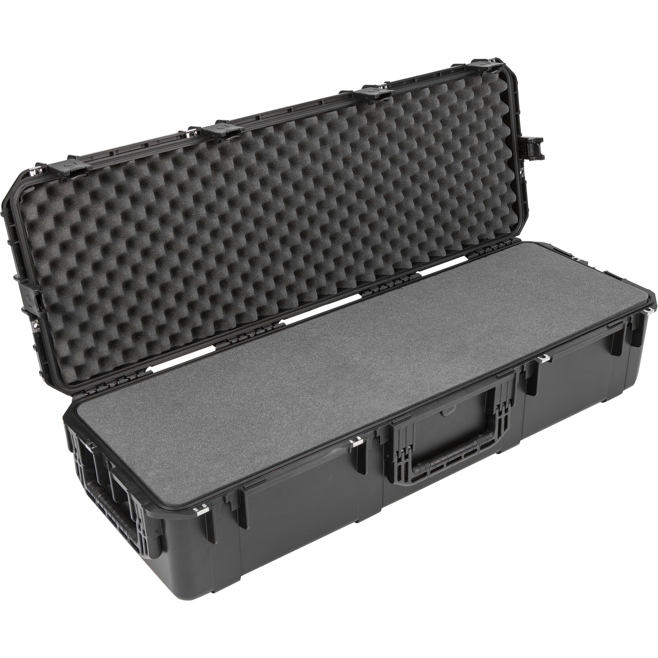 Store, transport, and protect your valuable gear in the black iSeries 4414-10 Waterproof Utility Case with Wheels and layered foam from SKB Cases . The case is waterproof, dustproof, and has ultra-high impact polymer construction, ABS double-throw latches, and a built-in purge valve. Carry the case with the large folding handles or roll it with the retractable extension handle and in-line skate-style wheels.