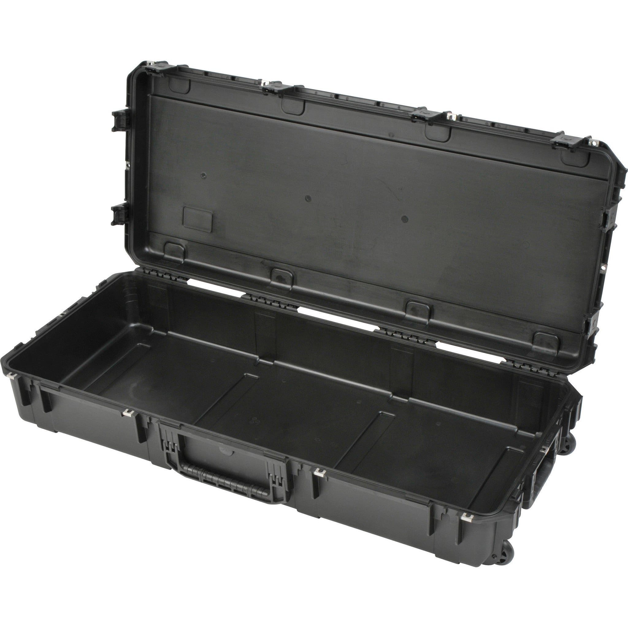 Made of injection-molded polypropylene resin, the black iSeries 4719-8 Waterproof Utility Case with Wheels from SKB is crushproof and made to protect your gear while traveling or in storage. The case also features an empty interior, allowing you to customize the space to best fit your needs. The polymer has a high resistance to corrosion, UV light, and solvents. Additionally, fungus cannot grow on the case.