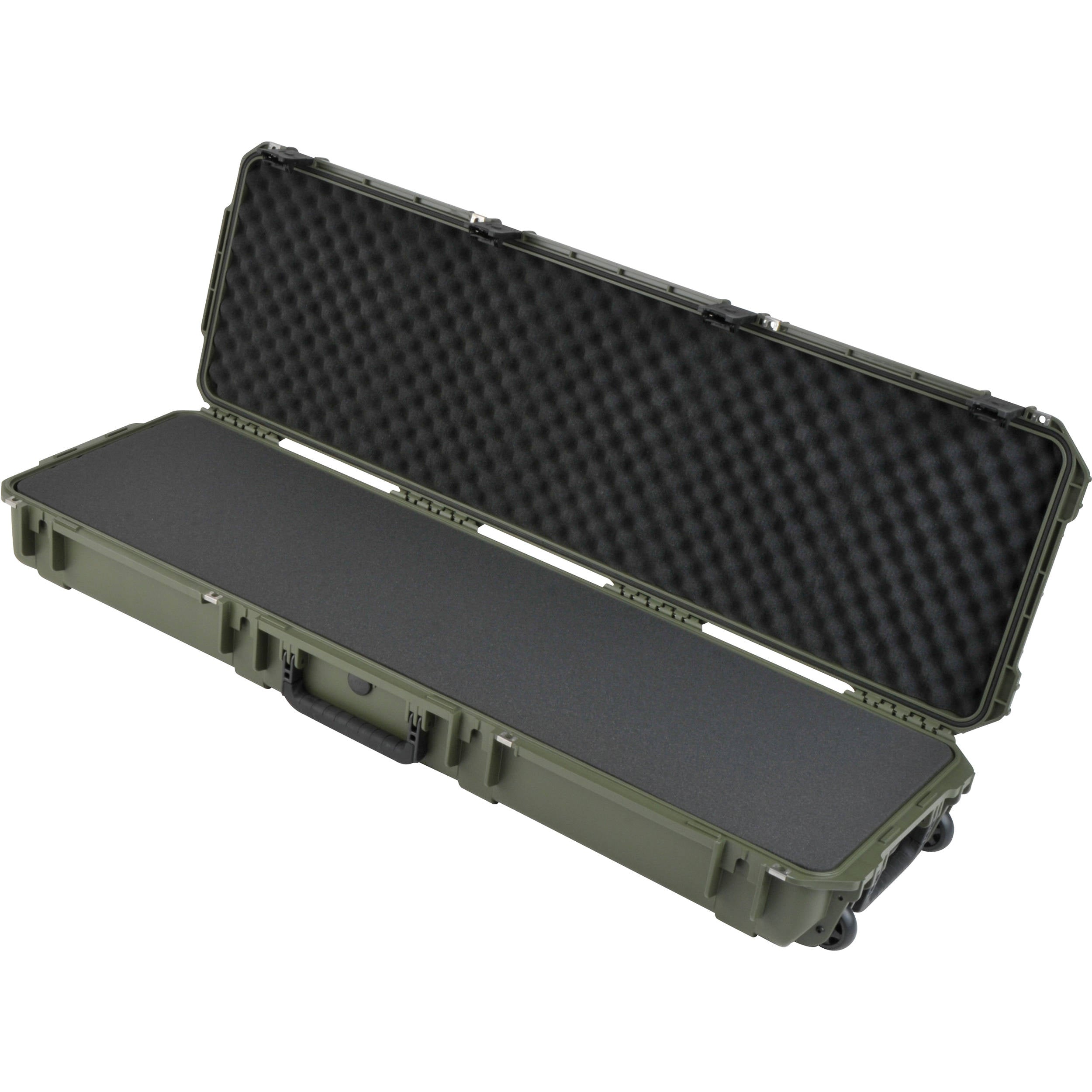 The olive drab green iSeries Long Rifle Case from SKB uses a bunk-bed storage system to accommodate two bows, two long rifles or a bow and rifle combination. The case features a fabric lined interior with molded EPS in the base and lid for structural strength and to separate the two rifles. Strategically placed foam pads in the bottom and lid of the case provide additional cushioning and prevent rifle movement during transport.