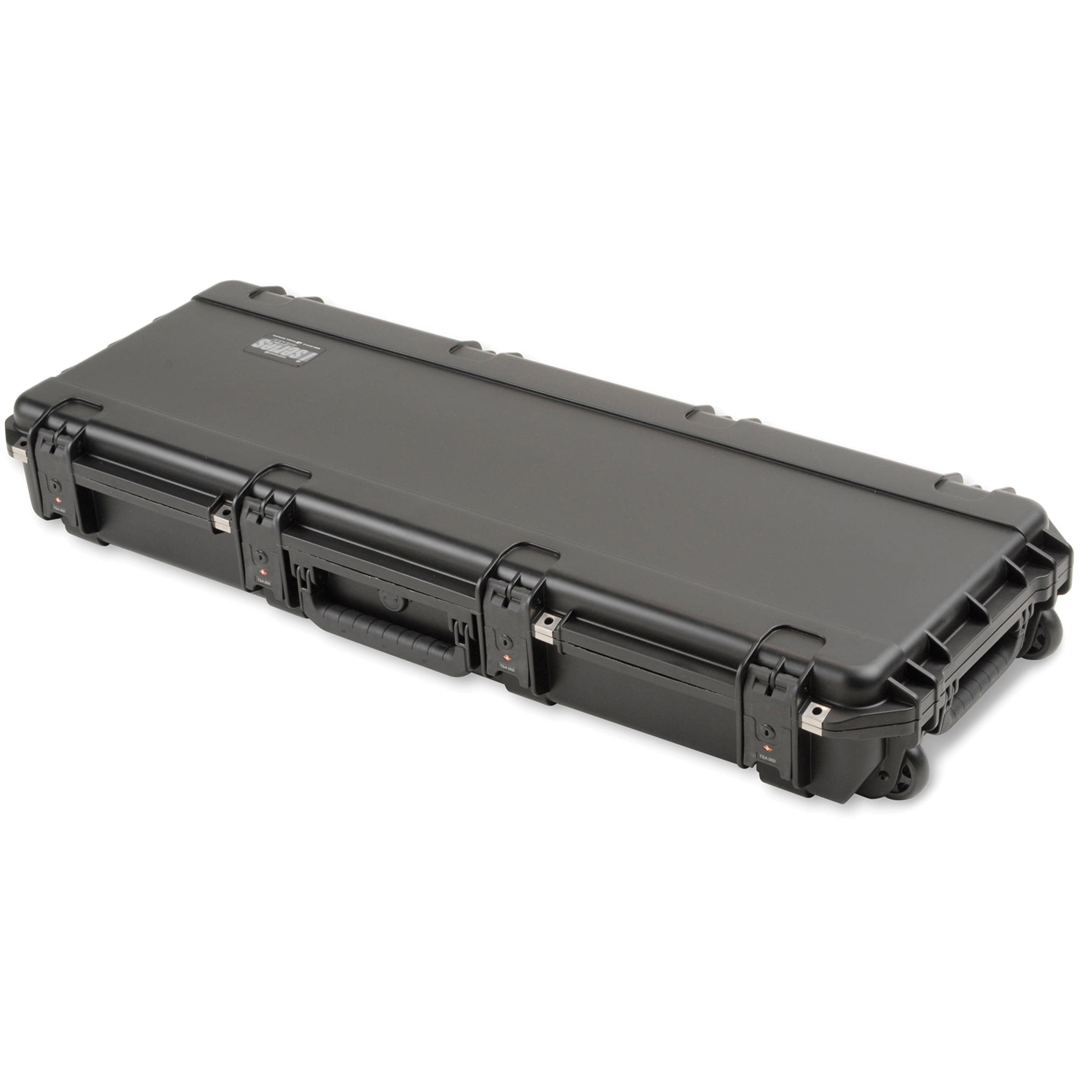 Four trigger latches, four reinforced padlock locations, and molded-in hinges with stainless steel hinge pins all add to the security of the case. Three rubber over-molded cushion grip handles snap into vertical/horizontal place for convenient carrying options. The case can be pulled on recessed in-line skate style wheels for easy transport and can be securely stacked for reliable storage. A built-in automatic ambient pressure equalization valve (MIL-STD-648C) allows for safe air travel.