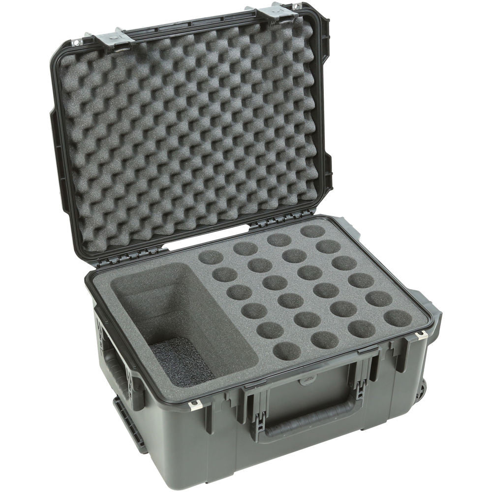 The SKB MC16 Waterproof Sixteen Mic Case (Black) is designed to hold 24 microphones stored vertically and is extra deep to accommodate longer condenser mics. There is a large padded accessory compartment for storage of cables, mic clips or other mic essentials. It is a waterproof, injection molded case made from ultra high-strength polypropylene copolymer resin. The case is resistant to corrosion and impact damage and has a gasketed, waterproof and airtight, submersible design. The interior has custom-cut foam padding and is cut on a water jet machine. The lid has convoluted foam for a compression fit. It also has an automatic ambient pressure equalization valve, continuous molded-in hinge and a trigger release latch system. The case is transported by a rubber over-molded cushion grip handle, an injection molded pull handle and built-in, in-line skate wheels.