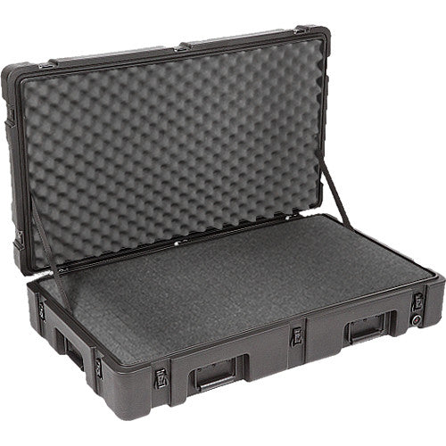 Store, transport, and protect your valuable gear in this black R Series 3821-7 Waterproof Utility Case with Wheels with cubed foam from SKB Cases. The case is waterproof, dustproof, and has LLDPE polyethylene impact-resistant construction, ABS double-throw latches, and a built-in purge valve. Carry the case with the large folding handles or roll it on the 2"-wide edge wheels.