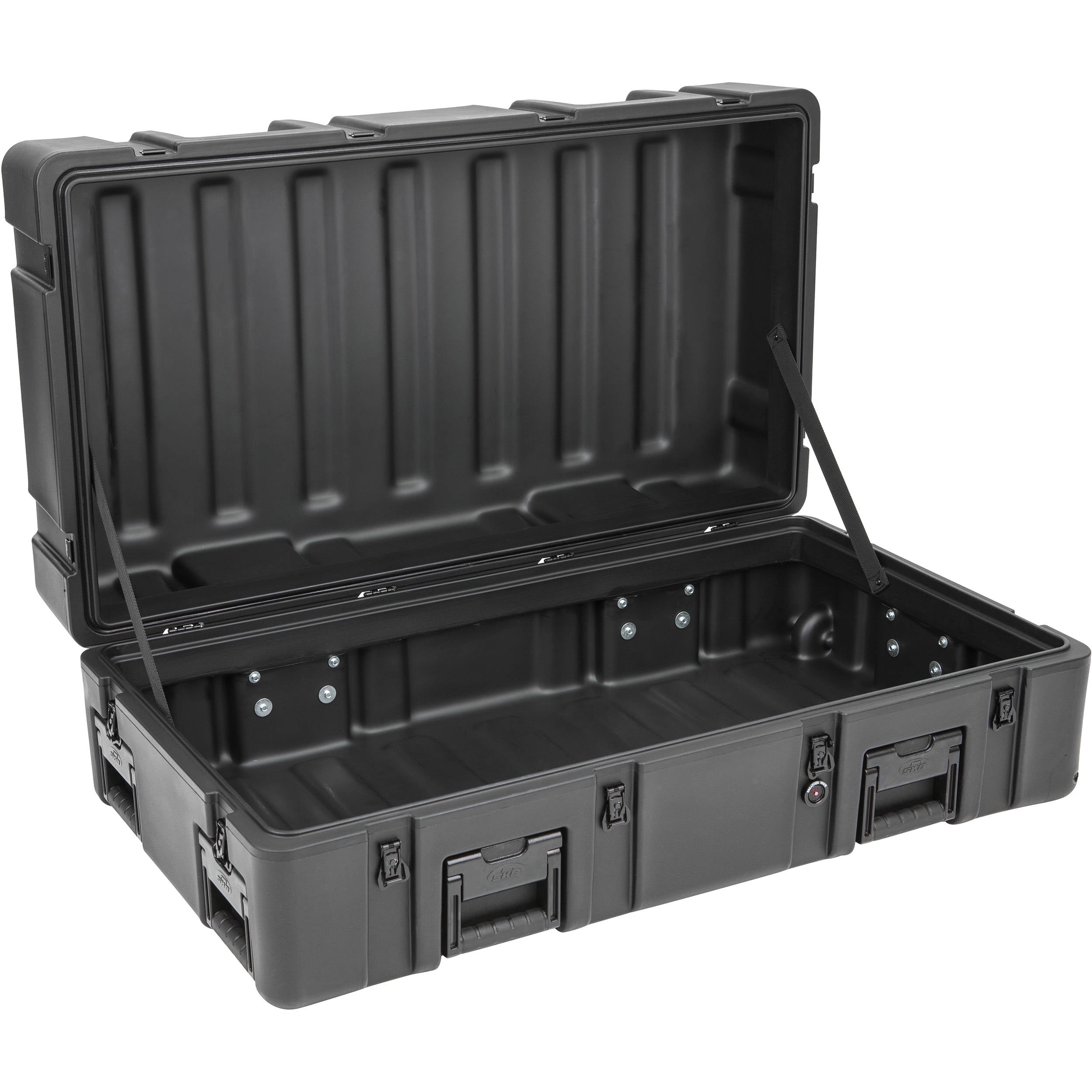 Store, transport, and protect your valuable gear in this black R Series 4222-14 Waterproof Utility Case with Wheels from SKB Cases . The case is waterproof, dustproof, and has LLDPE polyethylene impact-resistant construction, stainless steel latches, and a built-in purge valve. Carry the case with the large folding handles or roll it on the wheels.