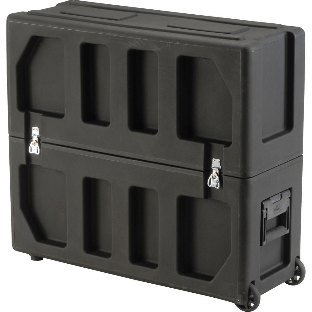 The SKB Roto-Molded LCD Case for 20 - 26" Screens is a carrying case for an LCD monitor. It is rotationally molded of LLDPE Polyethylene for strength and durability. The interior is crafted to hold your LCD screen in the desirable upright position, with a universal foam design that is easily adjustable. The case features a weather-resistant gasketed tongue and groove valance, along with two-sided heavy duty padlockable twist latches. Easy-glide wheels make for convenient maneuvering, and a durable, cushioned, rubber-molded tow handle, as well as cushioned lift handles on both sides, give you comfortable carrying / transport options. The case is made in the USA and comes with a lifetime warranty for the original owner.