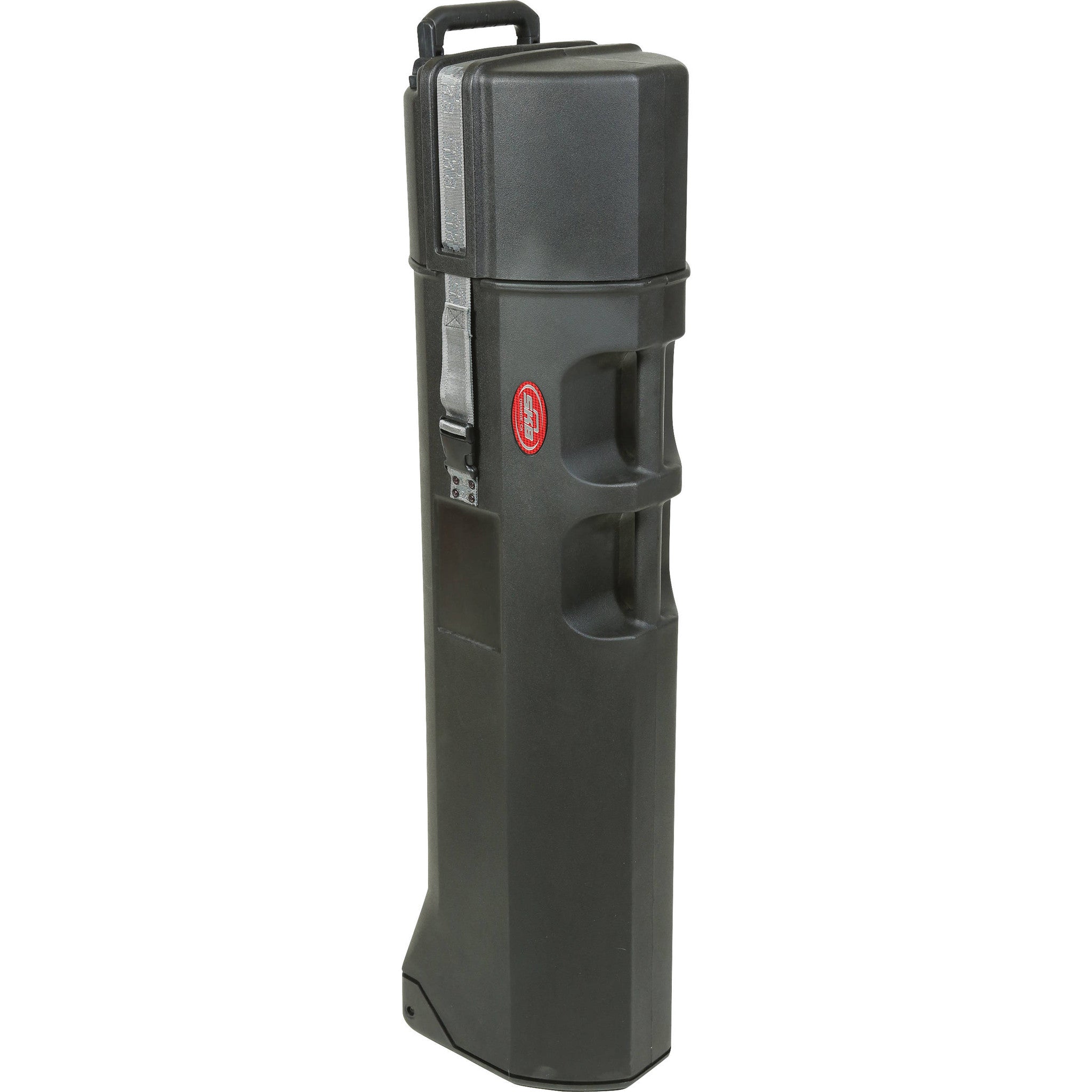 The 42" tall Roto-Molded Tripod Case with Wheels from SKB is designed to hold your tripod, or light stands. Foam in the lid and bottom protect your equipment from bumps and dings. Additionally, quiet glide in-line skate wheels with a top tow handle, and two molded-in carry handles provide portability. Access to your gear is via a removable top. Closure is achieved by adjustable web straps with a high-tension buckle. Both sides of the case have spaces for shipping labels.