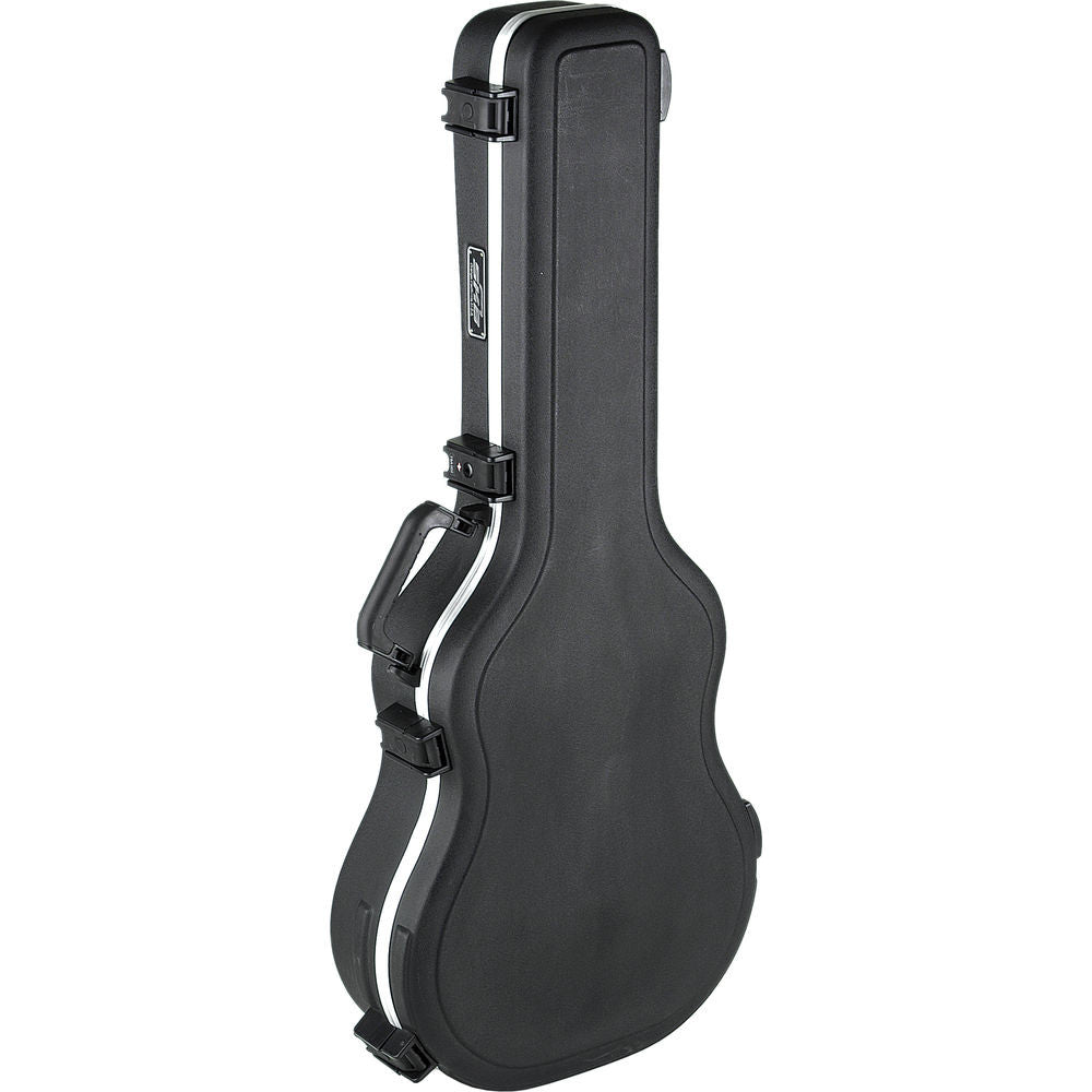 The SKB Thin-line Acoustic-Electric and Classical Deluxe Guitar Case is arched-top hardshell case that fits most thin-body acoustic-electric guitars and a variety of nylon and classical guitars. The case features SKB's deluxe plush lined fitted interior, bumper protected valence, full length neck support, molded-in bumper protection and molded-in feet to provide more secure guitar protection. The case includes SKB's cushioned rubber over-moulded handle for easier transporting, a fiberglass reinforced nylon trigger release latching system, TSA recognized and accepted latches and a compartment to accommodate guitar accessories.