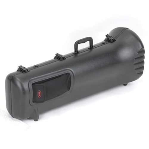 The SKB Universal Pro Tenor Trombone Case accommodates large and small bore F-attachment horns, with up to a 9" bell. Exterior has an inset accessory pouch. Engineered for open and traditional, wrap f-attachment tenors.