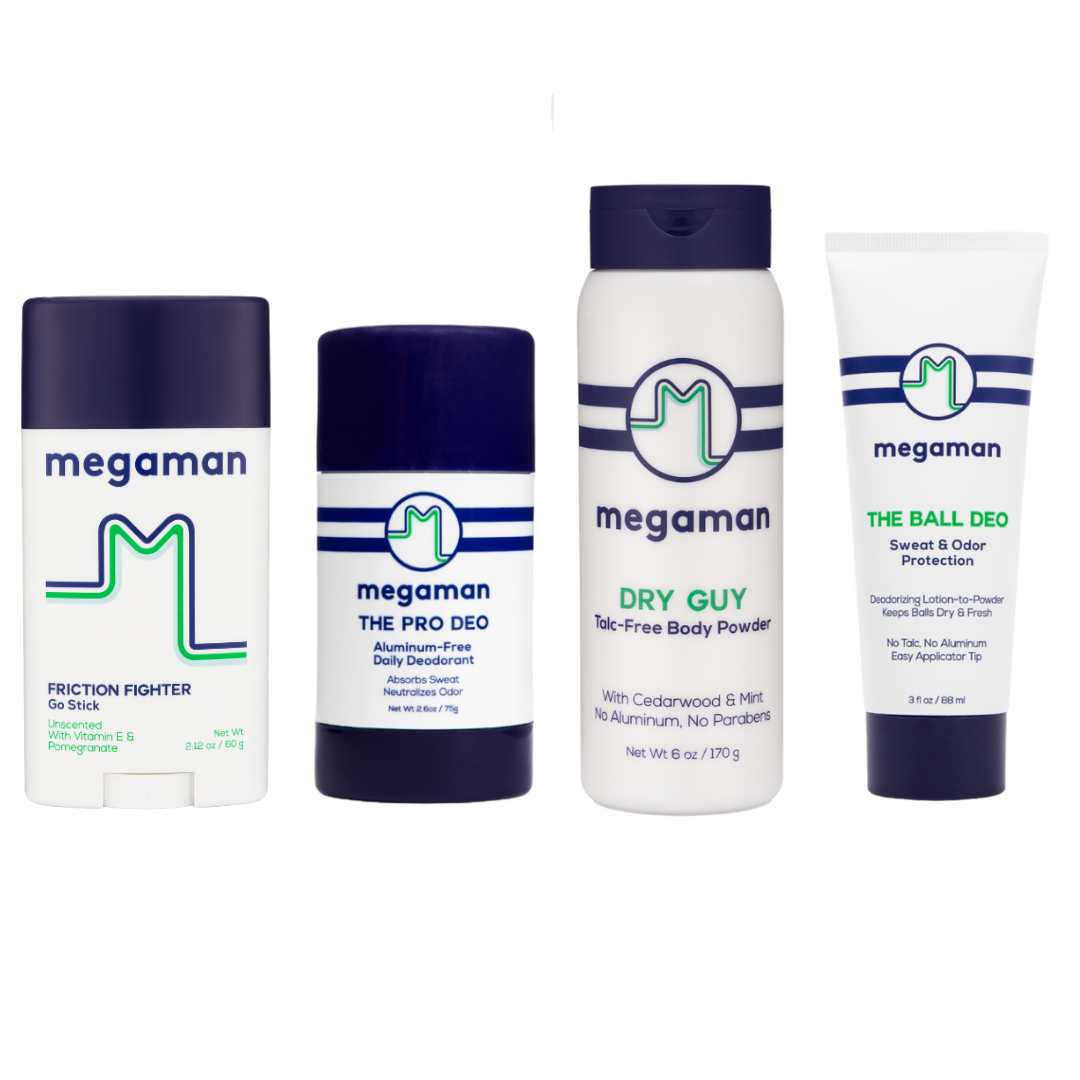 This set is the perfect gift for the guy who needs a (clean) break! We've made it easy & paired together all 4 Megaman products: Megaman Dry Guy Talc-Free Body Powder to absorb sweat all over, Friction Fighter Go-Stick to kick chafing to the curb, The Ball Deo to fight funk and sweat âdown under,â and The Pro Deo for an aluminum-free underarm deodorant that actually works.Â