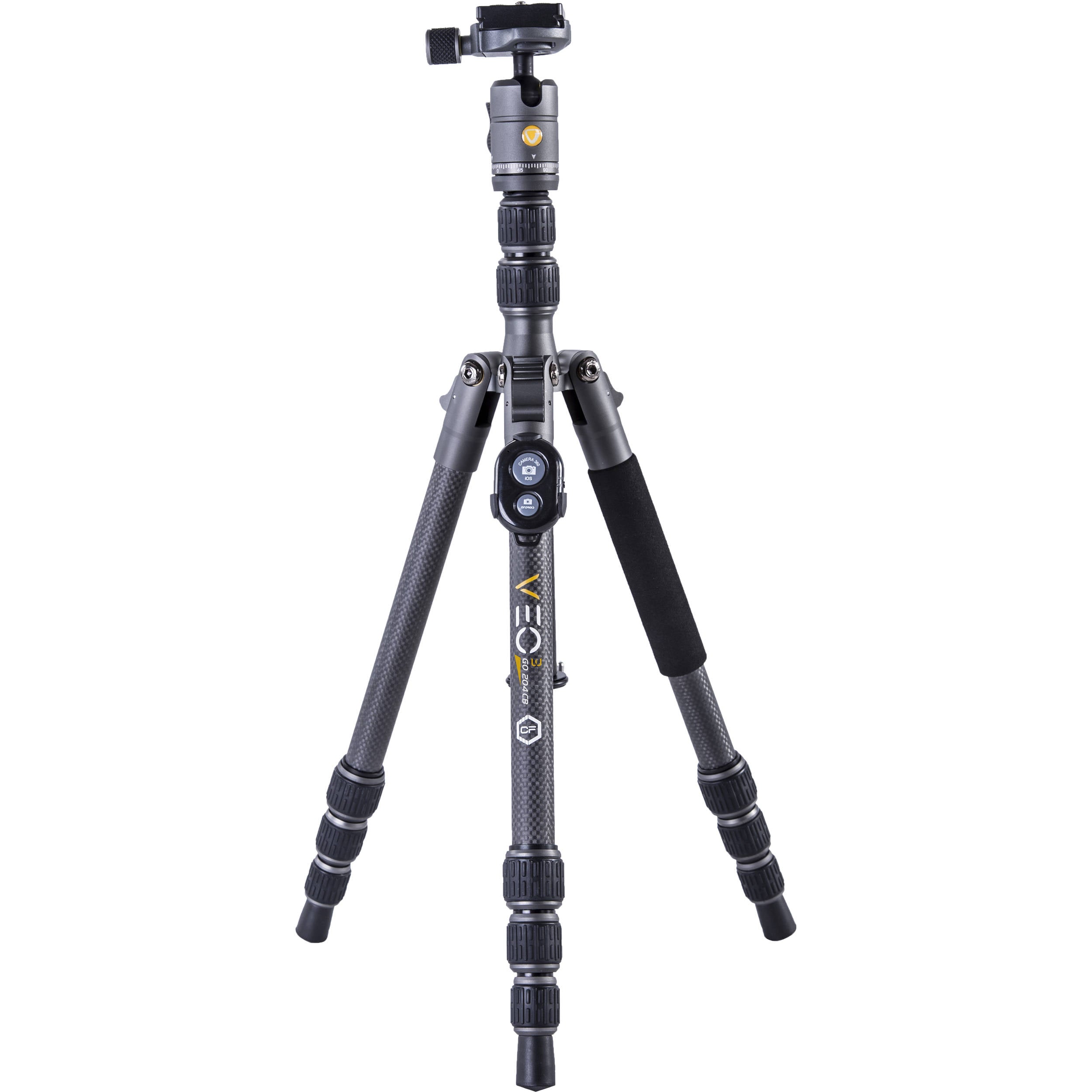 This VEO 3 GO 204CB Carbon Fiber Tripod/Monopod with T-45 Ball Head from Vanguard is a support system that features a tripod with a detachable leg and removable center column that can be combined to form a monopod with a 52.8" height. Cameras, lenses, or sport optics that are compatible with a 1/4"-20 mount can be connected to the included quick release plate, which is secured to the tripod/monopod's ball head using an Arca-type quick release clamp. The T-45 Ball Head is removable, provides up to a 91° tilt for portrait orientation and 360° of rotation, and can be locked into place along its range of movement. Also provided is a smartphone connector and a Bluetooth remote, allowing the monopod formed by the detachable leg and removable center column to be used as a smartphone selfie stick.