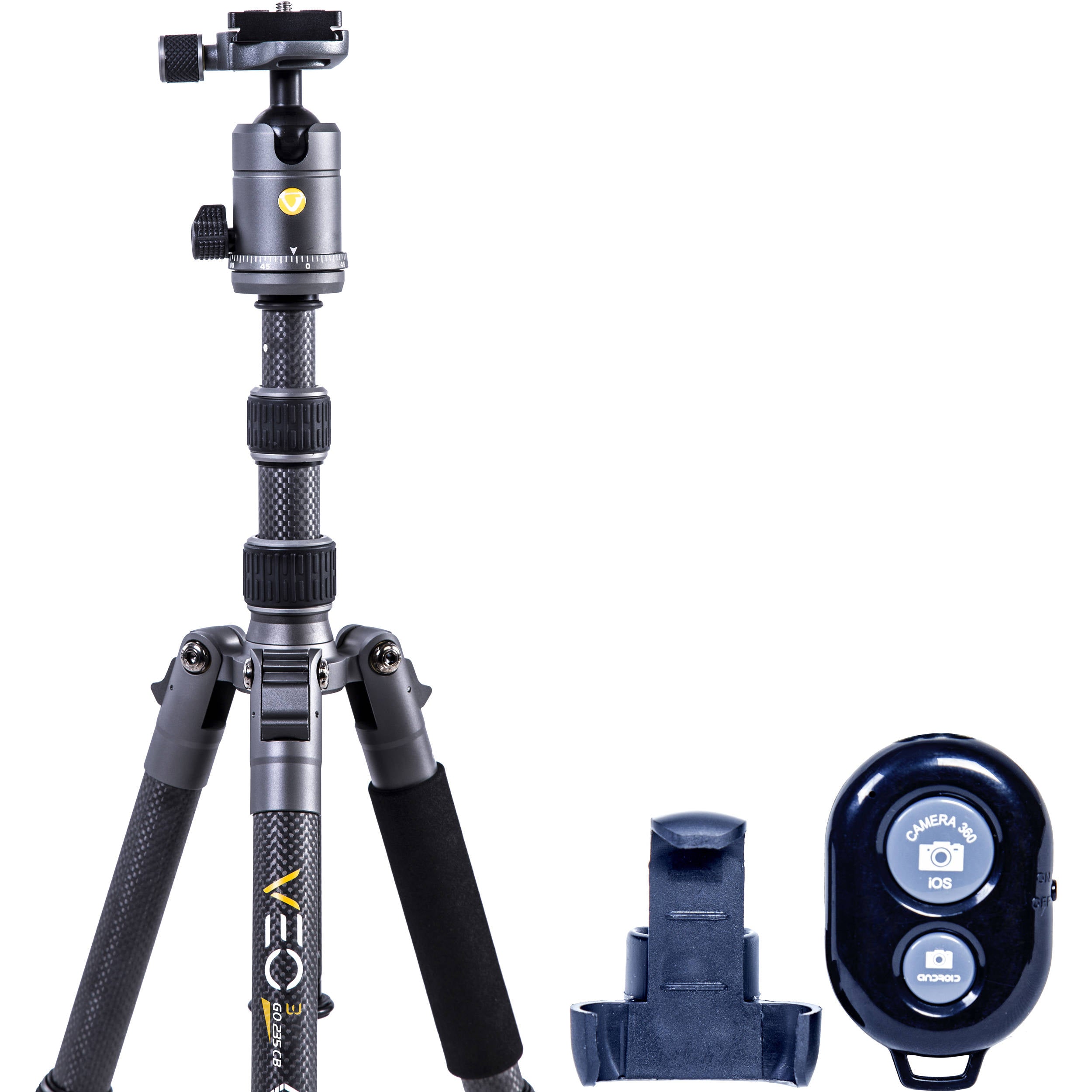 This VEO 3 GO 235CB Carbon Fiber Tripod/Monopod with T-50 Ball Head from Vanguard is a support system that features a tripod with a detachable leg and removable center column that can be combined to form a monopod with a 54.3" height. Cameras, lenses, or sport optics that are compatible with a 1/4"-20 mount can be connected to the included quick release plate, which is secured to the tripod/monopod's ball head using an Arca-type quick release clamp. The T-50 Ball Head is removable, provides up to a 91° tilt for portrait orientation and 360° of independent rotation, and can be locked into place along its range of movement. Also provided is a smartphone connector and a Bluetooth remote, allowing the monopod formed by the detachable leg and removable center column to be used as a smartphone selfie stick.